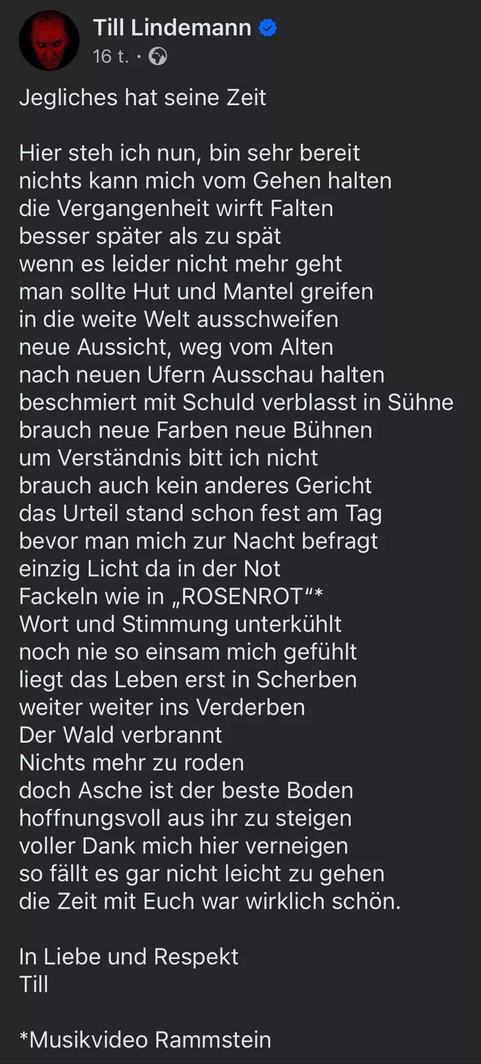Bandets forsanger Till Lindemann har sideløbende på sine egne sociale medier offentliggjort et digt, hvor han bearbejder beskyldningerne og giver tvetydelige udsagn om sin kunstneriske fremtid. Till Lindemann beskriver tiden med beskyldningerne imod sig selv som en yderst svær og ensom tid. Han skriver, at han blev dømt på forhånd og blev "brændt på bålet", ligesom i musikvideoen til Rammstein-sangen "Rosenrot". Endvidere skriver han, at han tager af sted, og at alt har sin tid. Om han taler om sit soloprojekt eller endda Rammstein, vides ikke (oversat fra tysk, originalteksten følger nederst):