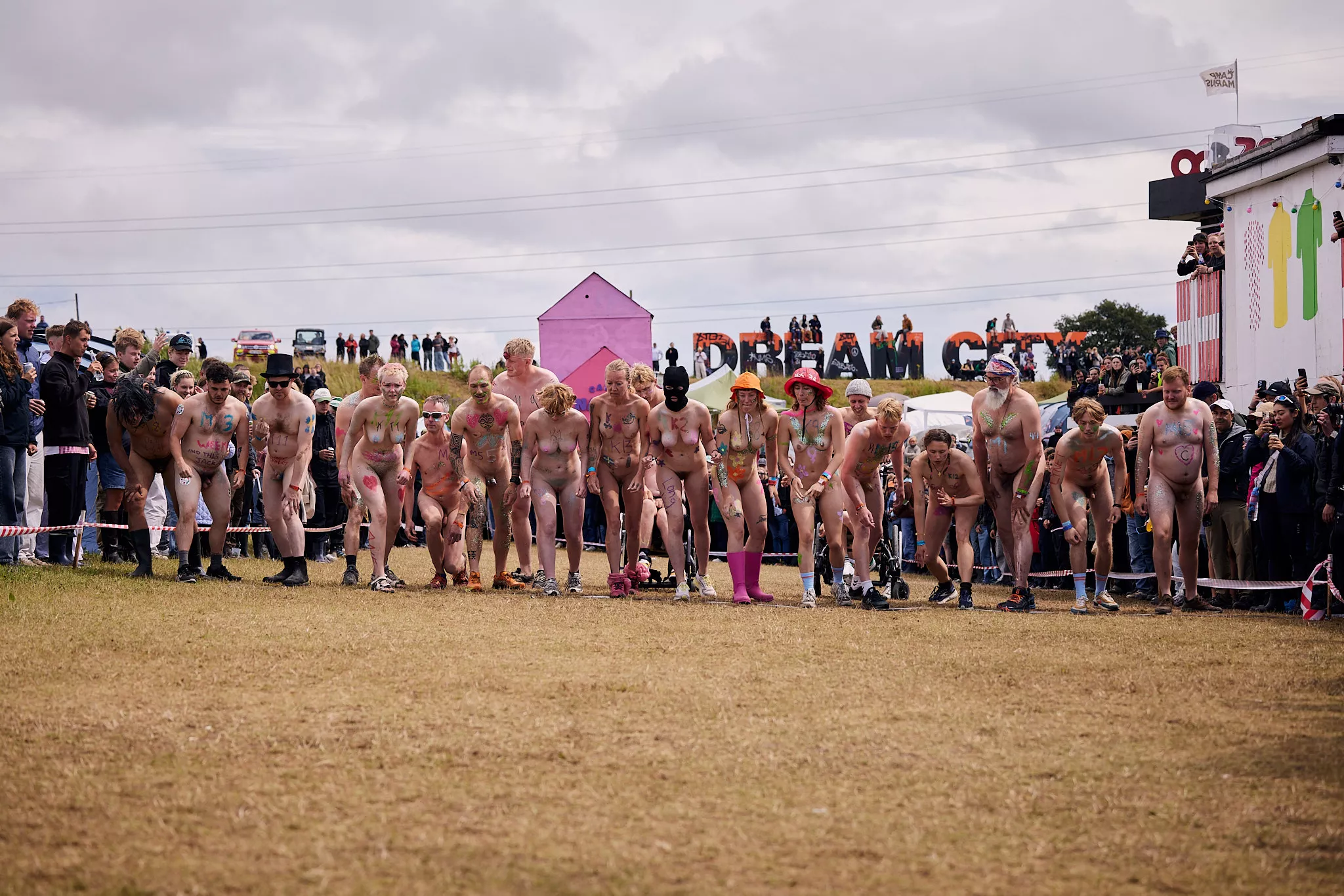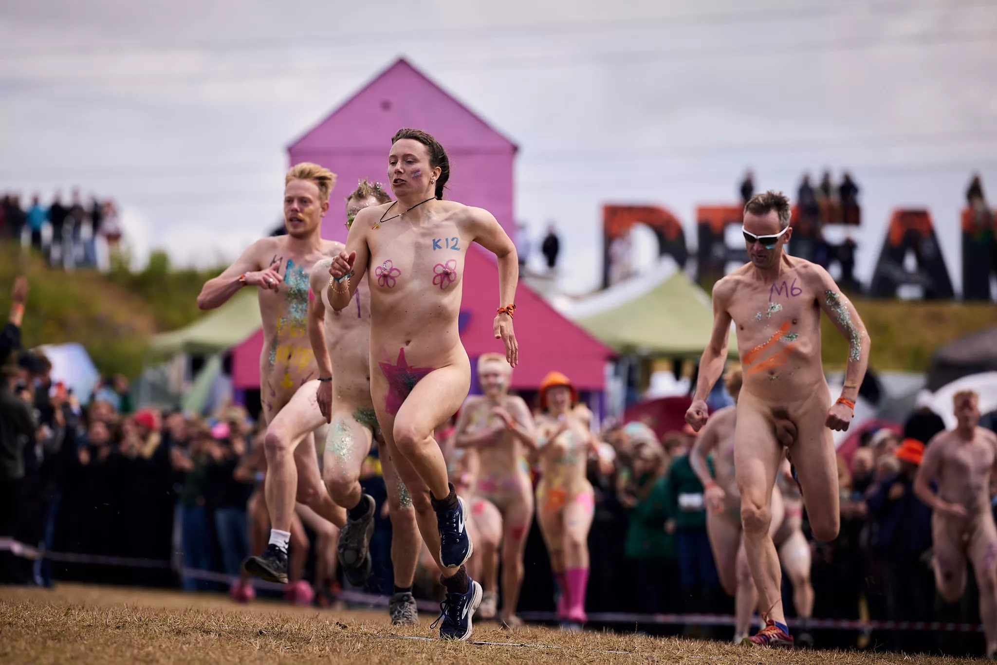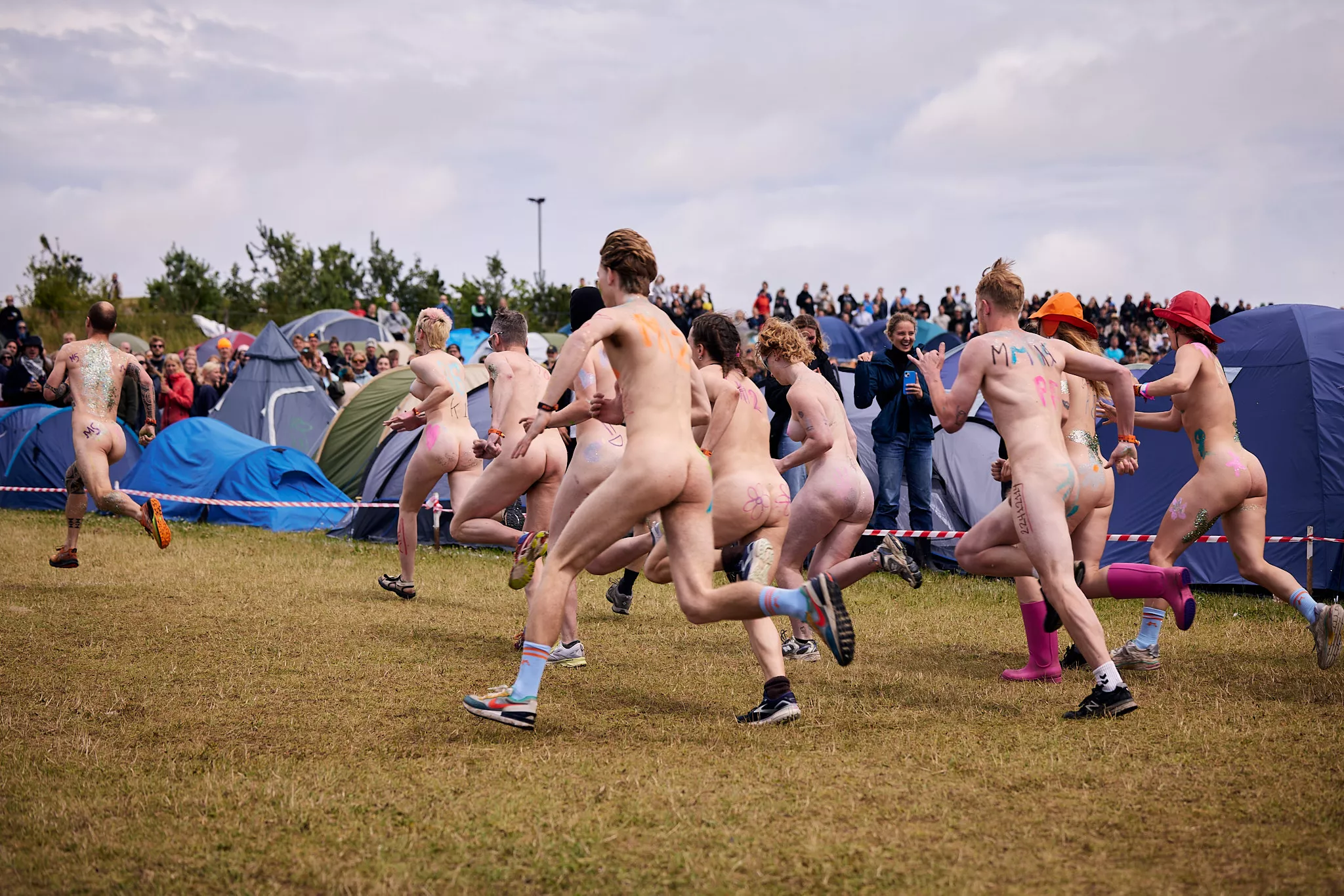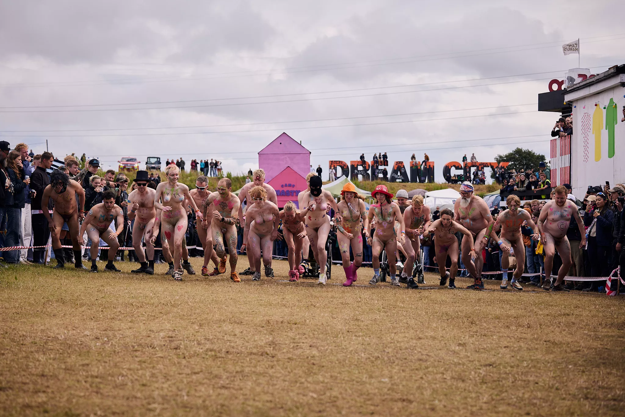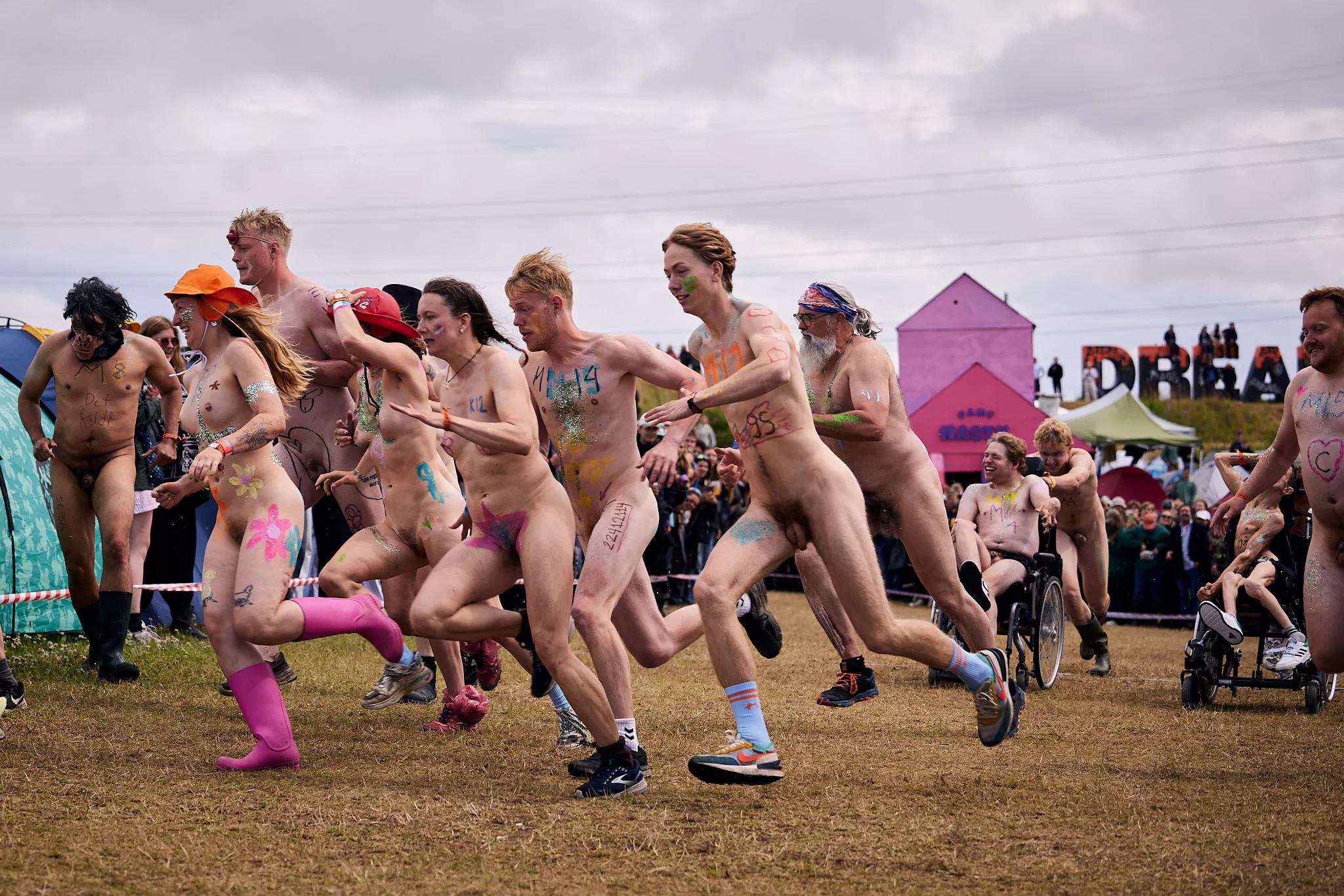 Man kunne godt frygte, at det mangeårige nøgenløb på Roskilde Festivals Dream City-område på campingarealet ville drukne i regn og mudder, da vejrguderne virkeligt har åbnet for sluserne halvanden time før starten klokken 14. Men de samme vejrguderne forbarmer sig åbenbart, for solen skinner, og løbebanen er ikke nær så tilmudret, som man kunne frygte, da klokken nærmer sig to. Fremmødet tæller adskillige hundrede, der skal se de 10 mænd, heraf to kørestolsbrugere med hjælper, og seks kvinder, der splitternøgne skal løbe rundt på den et par hundrede meter lange bane. Medieopbuddet er som vanligt stort.