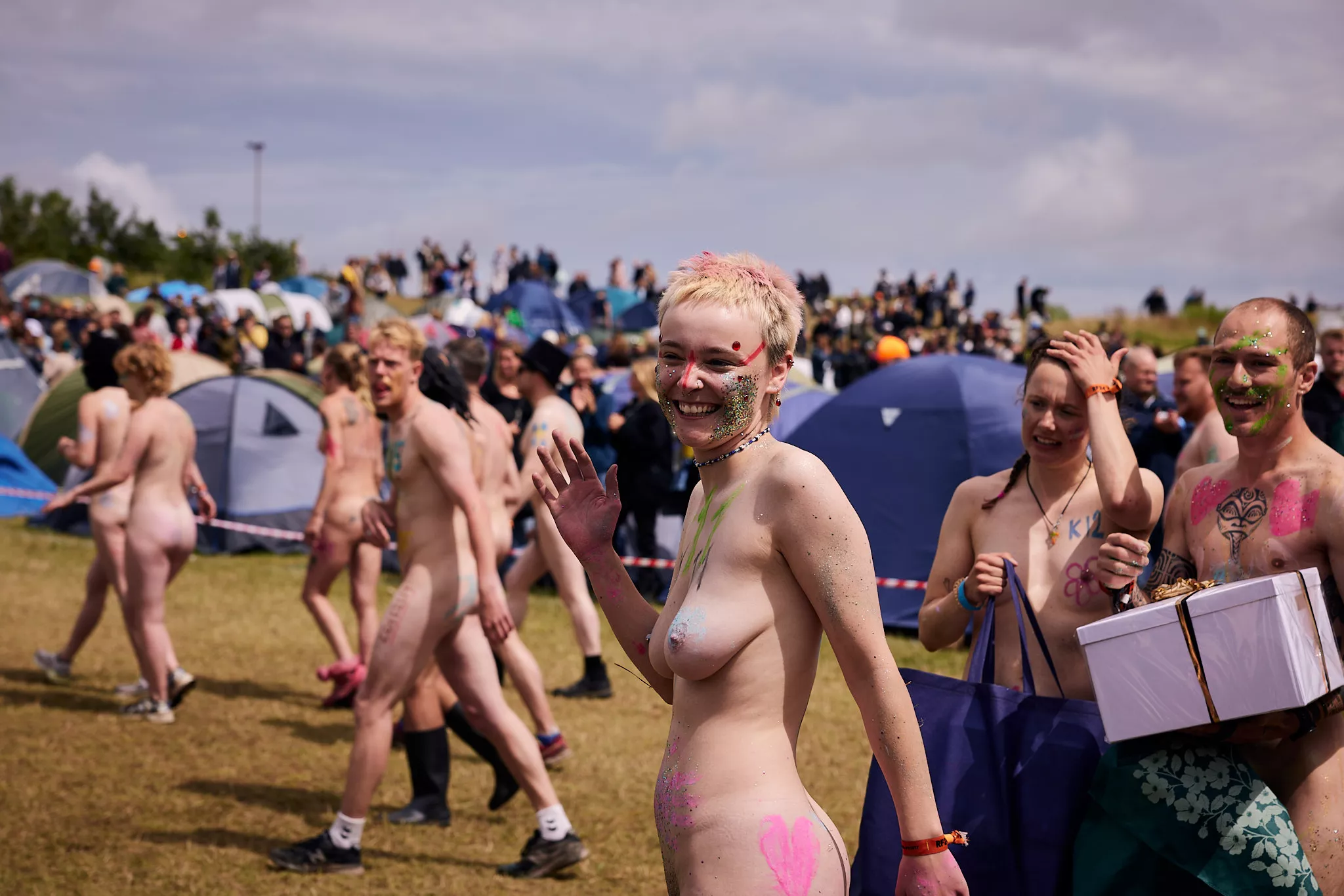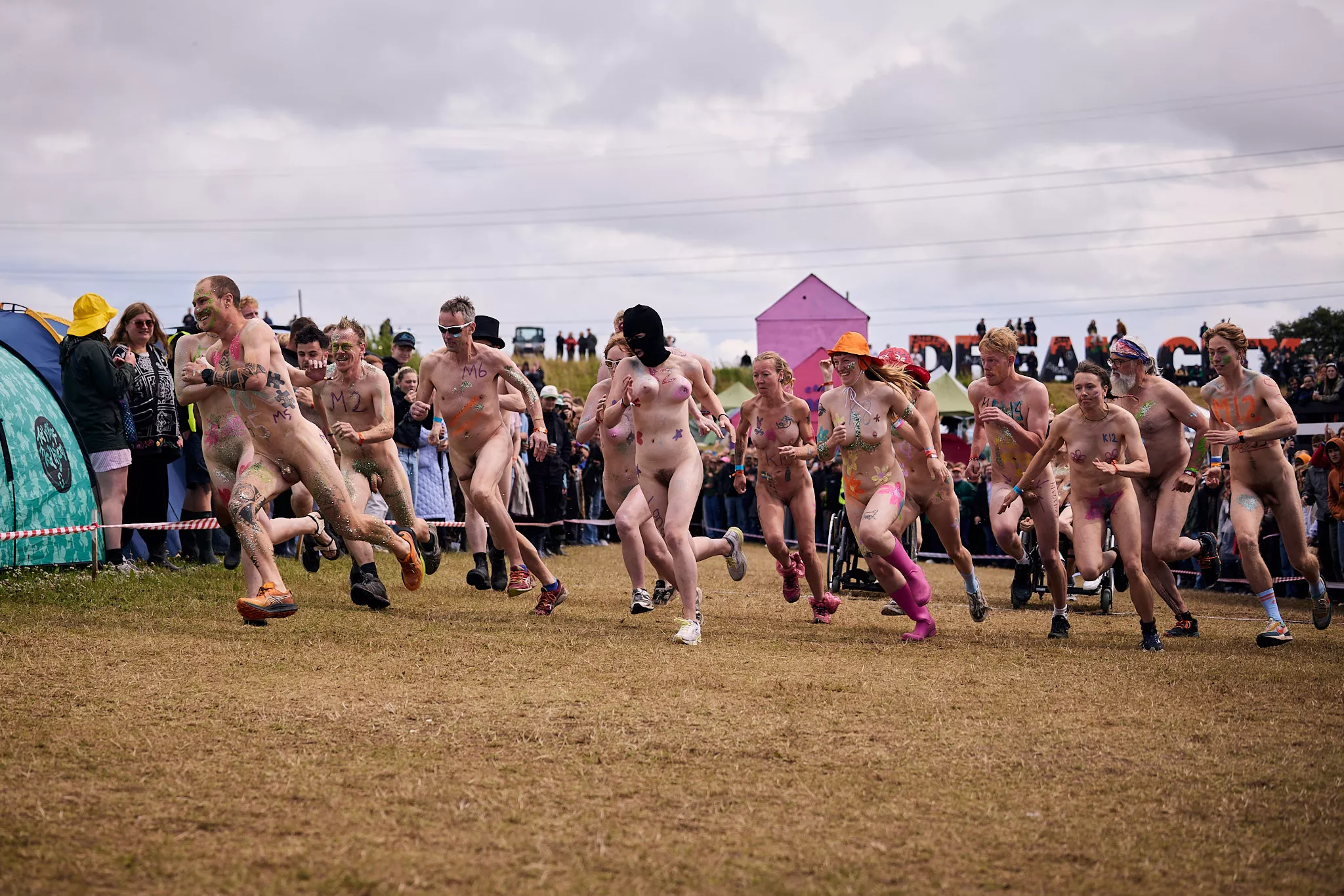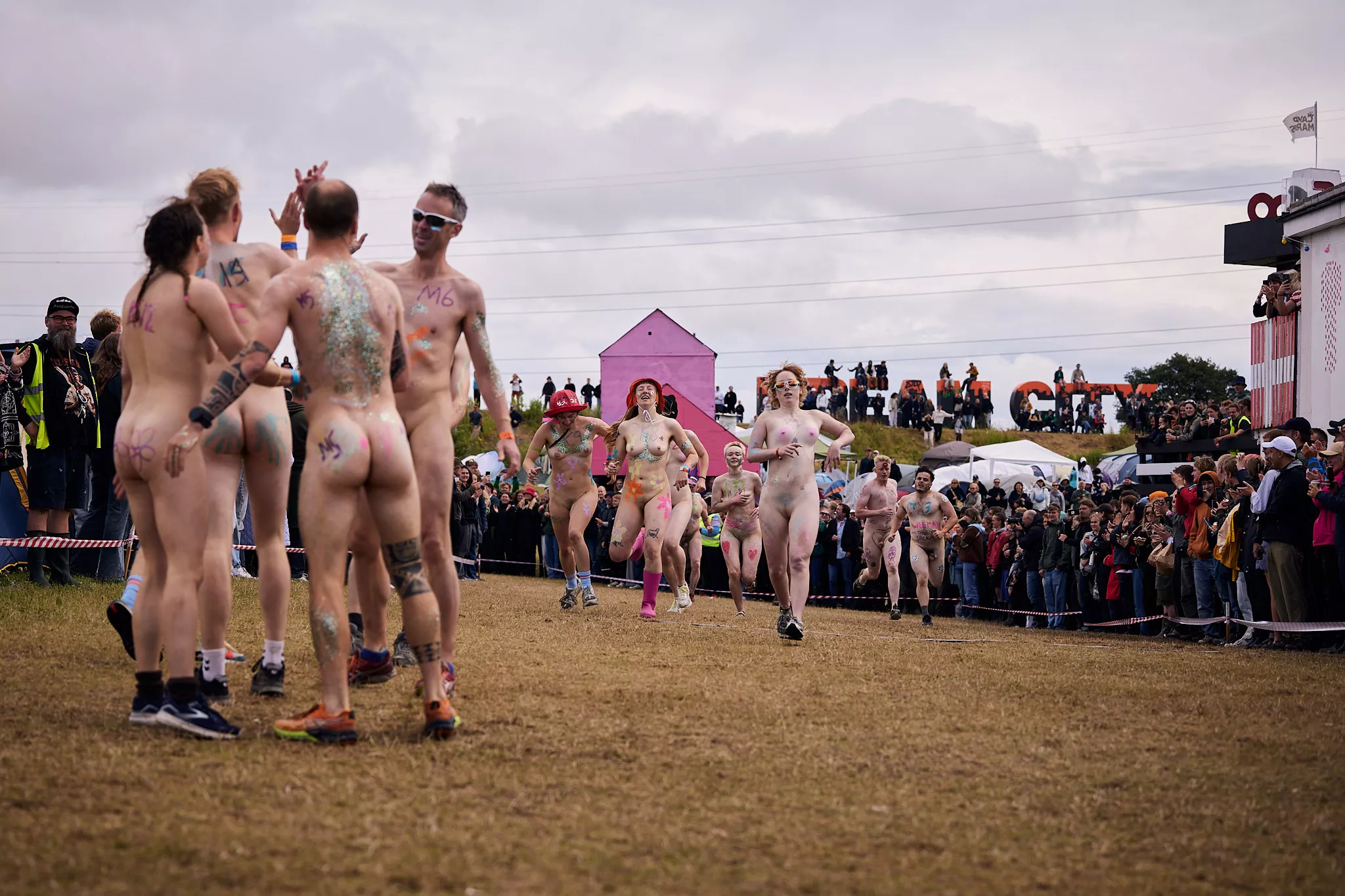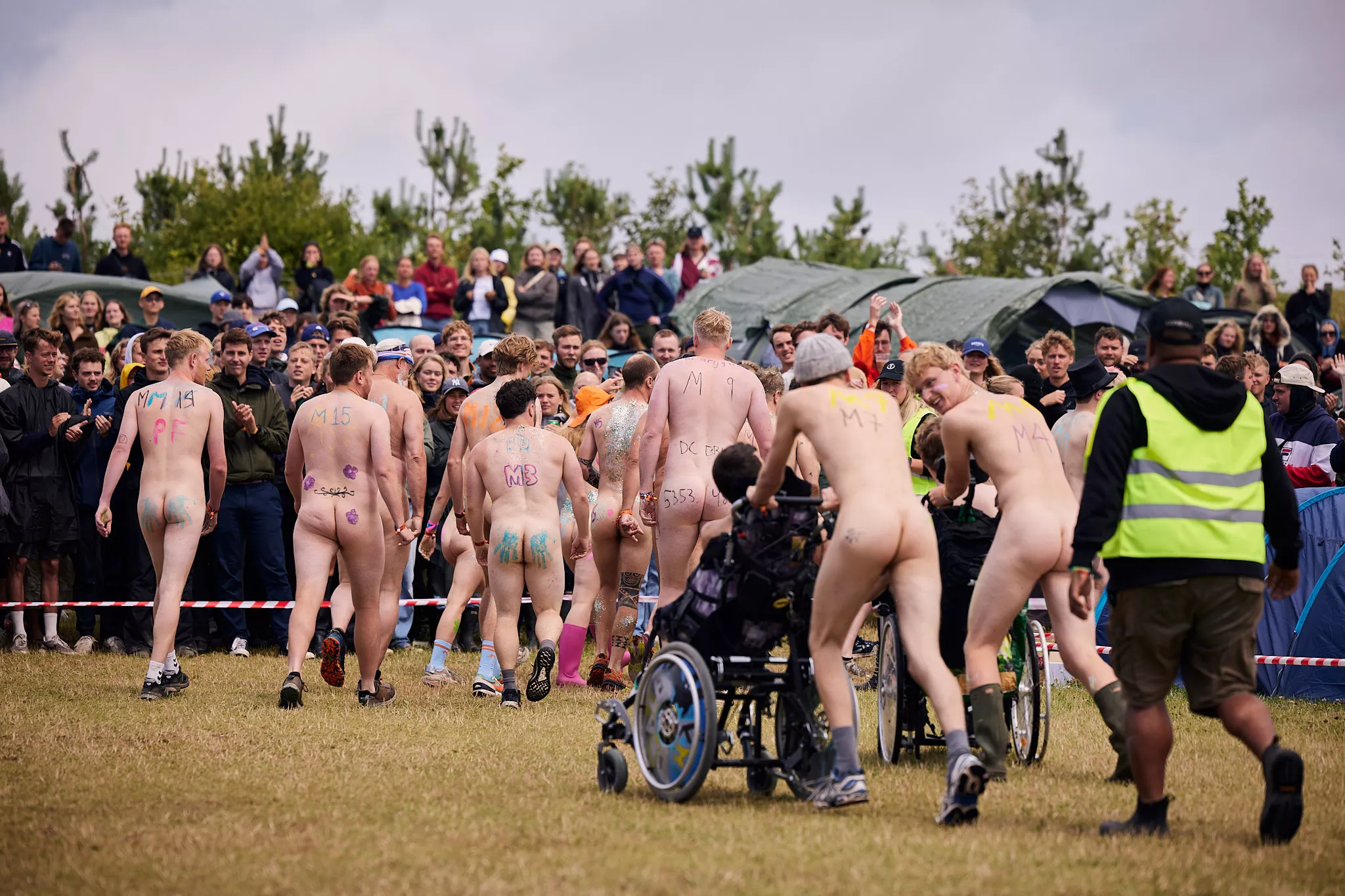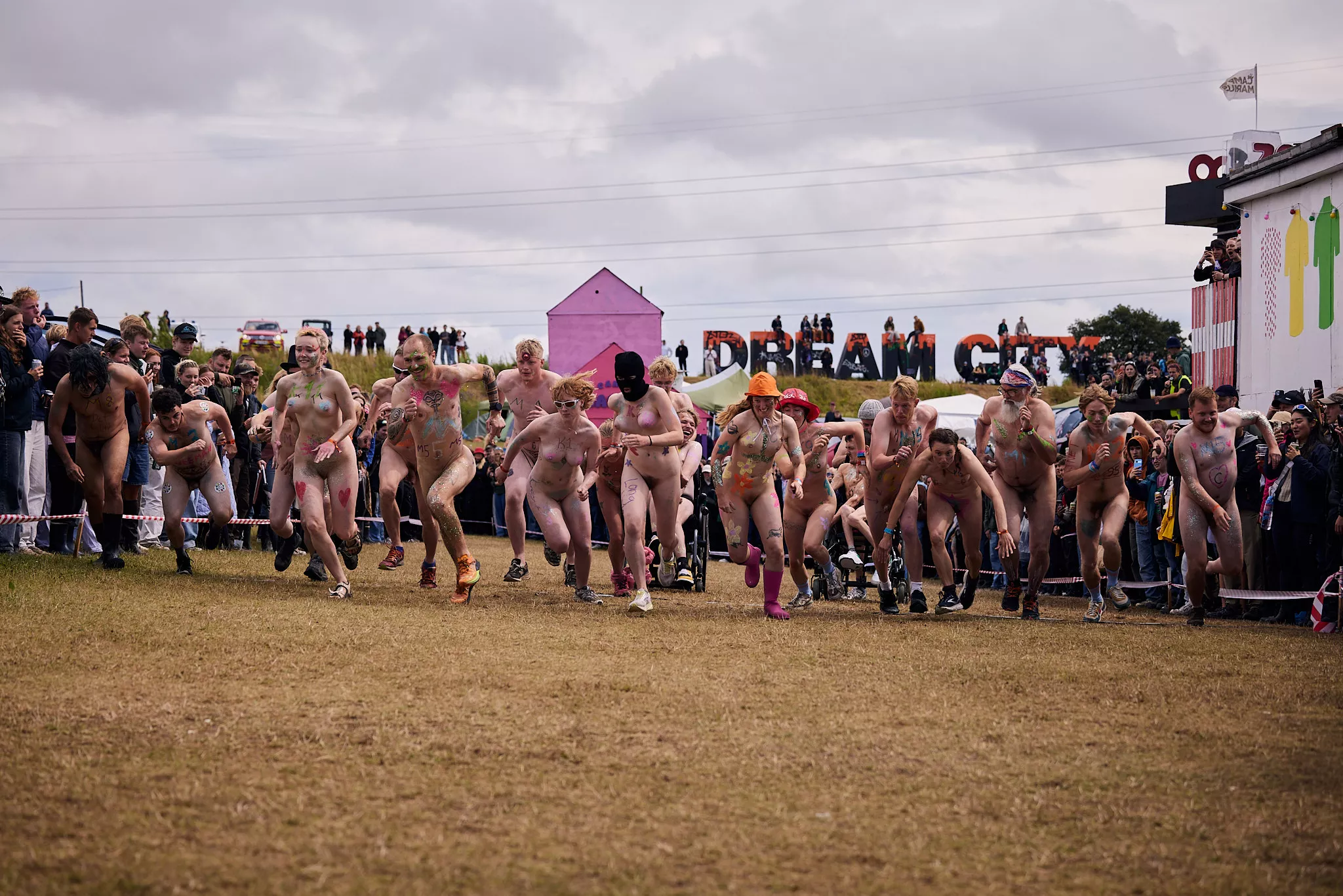 Man kunne godt frygte, at det mangeårige nøgenløb på Roskilde Festivals Dream City-område på campingarealet ville drukne i regn og mudder, da vejrguderne virkeligt har åbnet for sluserne halvanden time før starten klokken 14. Men de samme vejrguderne forbarmer sig åbenbart, for solen skinner, og løbebanen er ikke nær så tilmudret, som man kunne frygte, da klokken nærmer sig to. Fremmødet tæller adskillige hundrede, der skal se de 10 mænd, heraf to kørestolsbrugere med hjælper, og seks kvinder, der splitternøgne skal løbe rundt på den et par hundrede meter lange bane. Medieopbuddet er som vanligt stort.