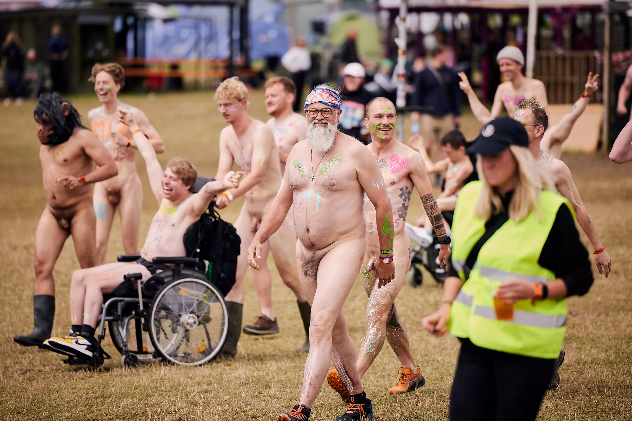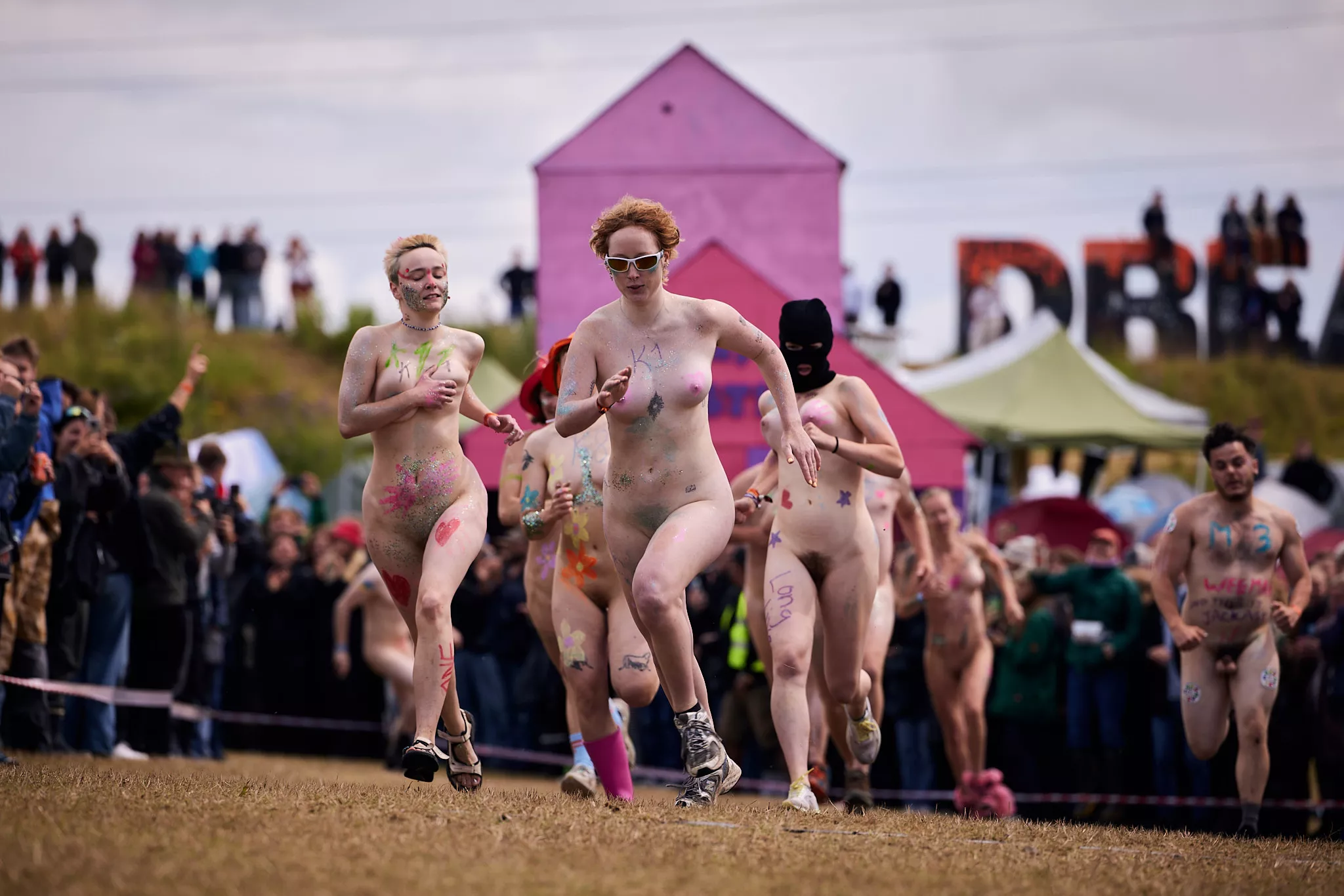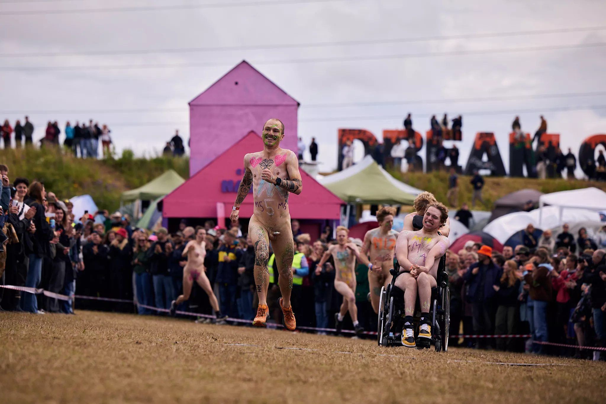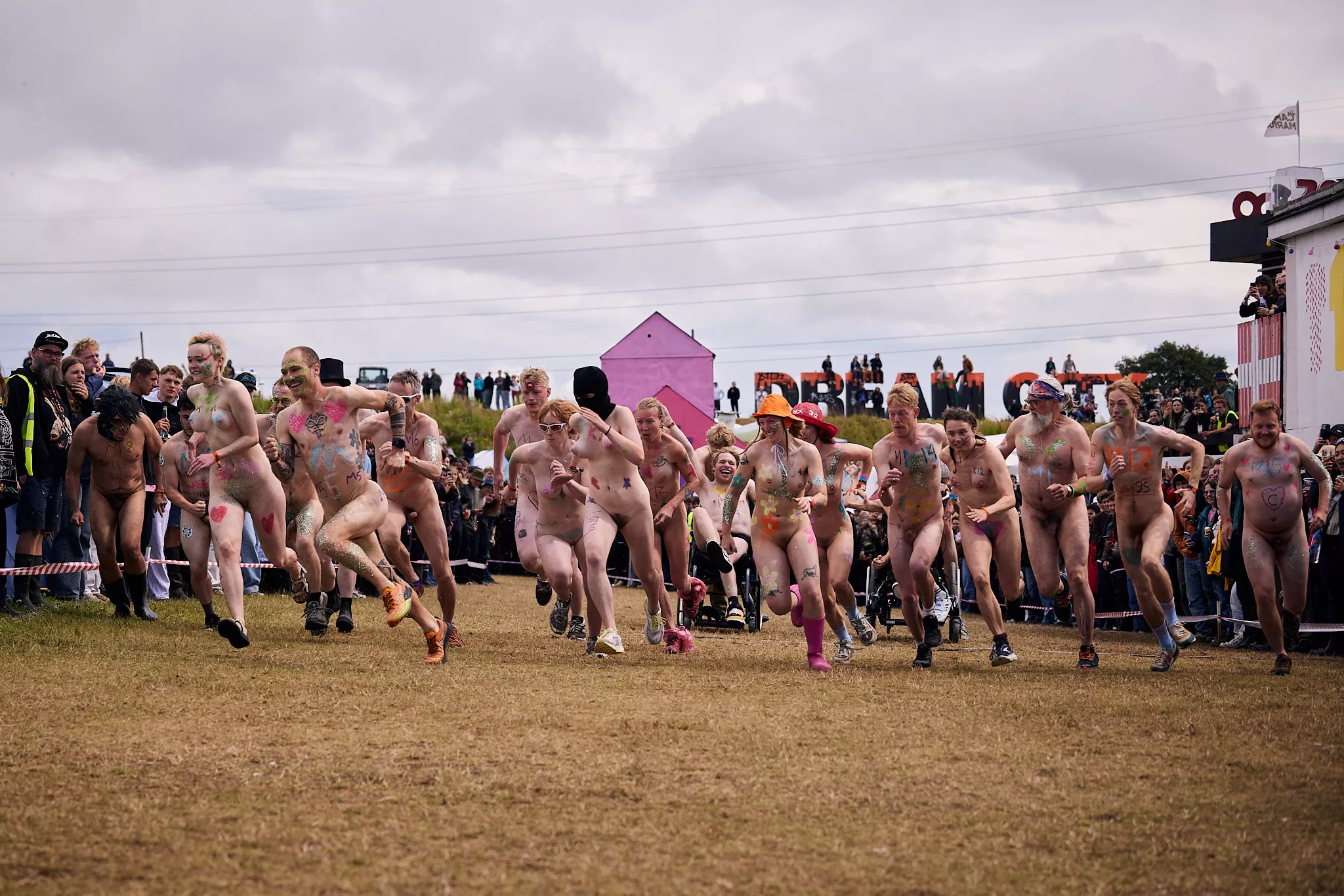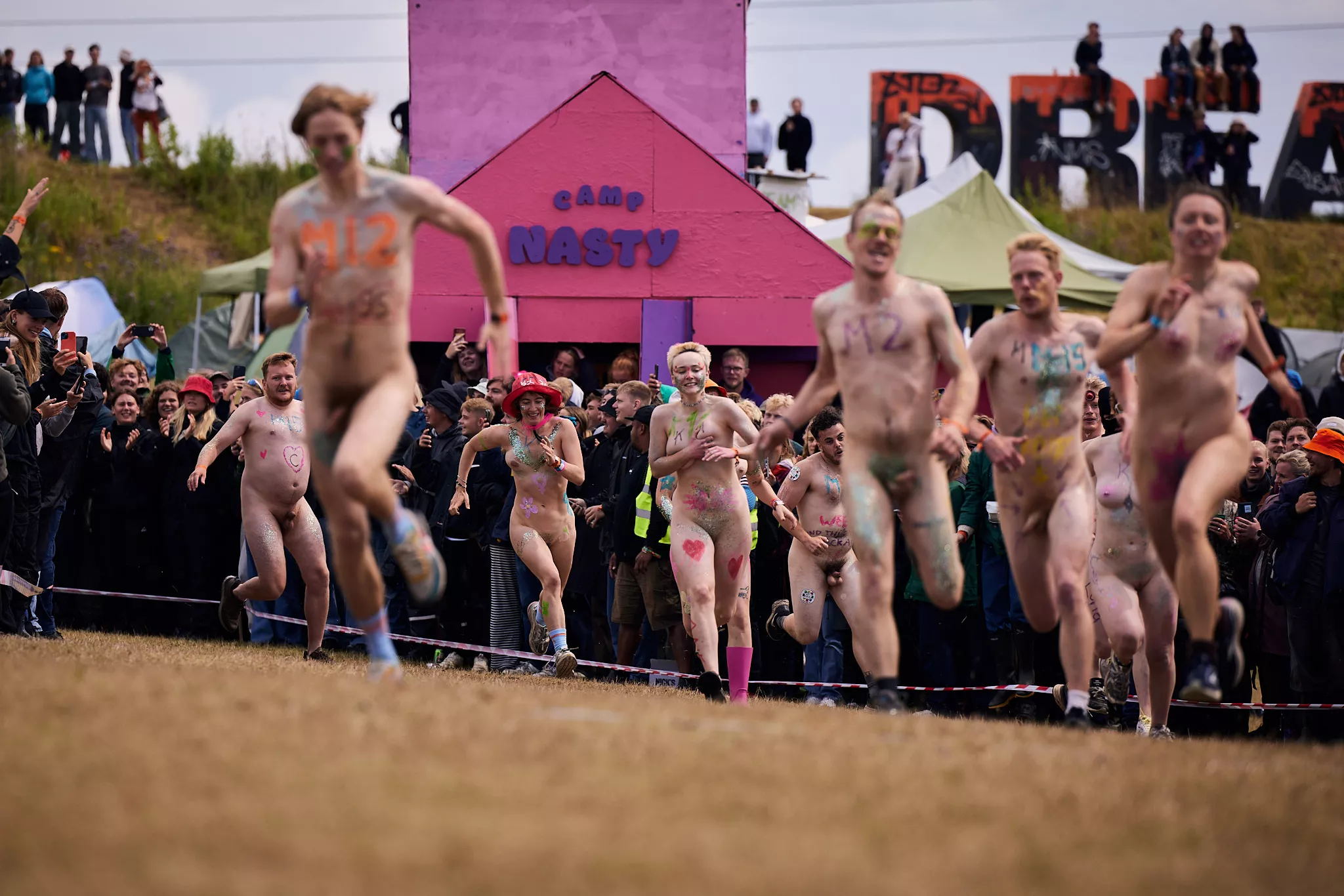 Man kunne godt frygte, at det mangeårige nøgenløb på Roskilde Festivals Dream City-område på campingarealet ville drukne i regn og mudder, da vejrguderne virkeligt har åbnet for sluserne halvanden time før starten klokken 14. Men de samme vejrguderne forbarmer sig åbenbart, for solen skinner, og løbebanen er ikke nær så tilmudret, som man kunne frygte, da klokken nærmer sig to. Fremmødet tæller adskillige hundrede, der skal se de 10 mænd, heraf to kørestolsbrugere med hjælper, og seks kvinder, der splitternøgne skal løbe rundt på den et par hundrede meter lange bane. Medieopbuddet er som vanligt stort.