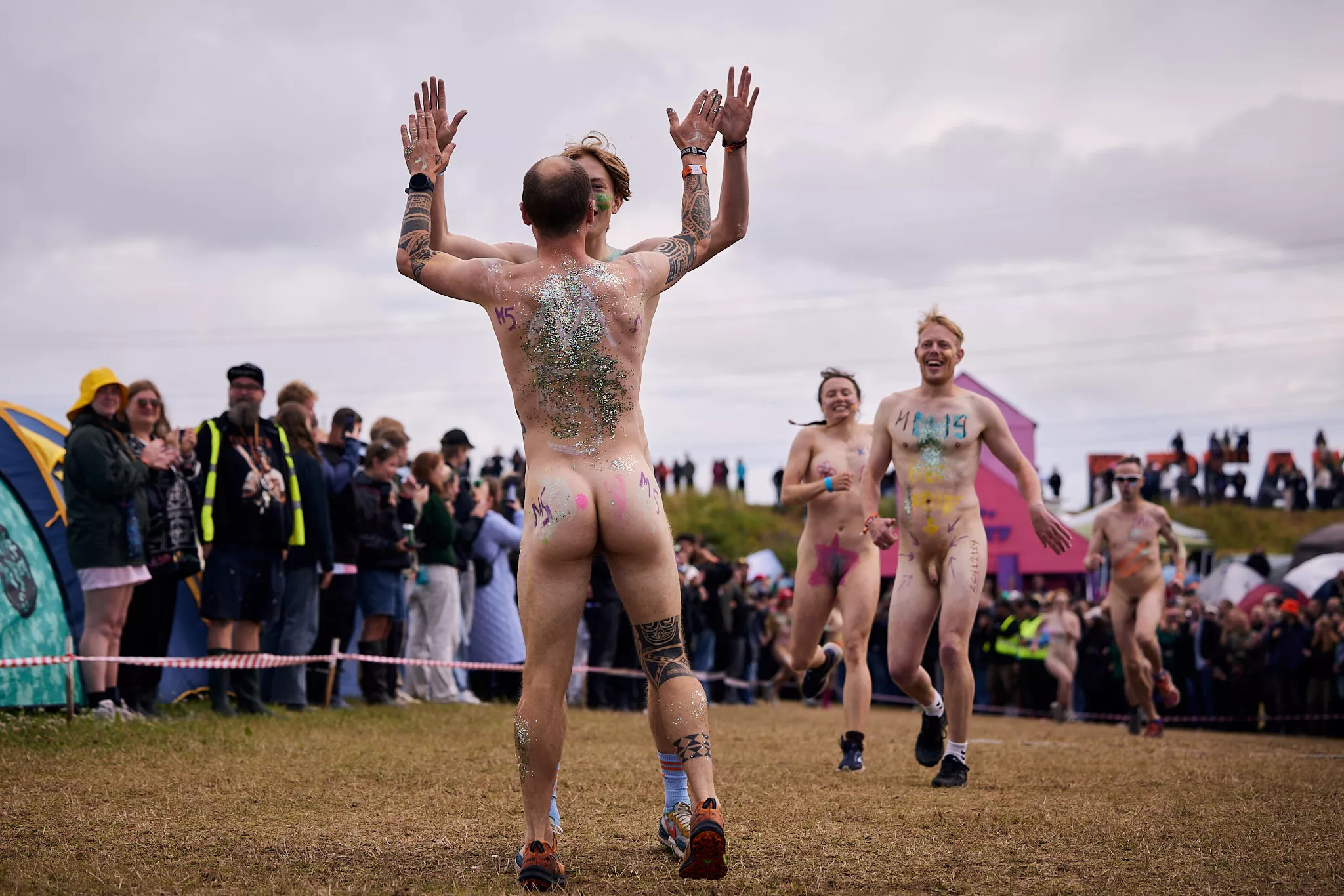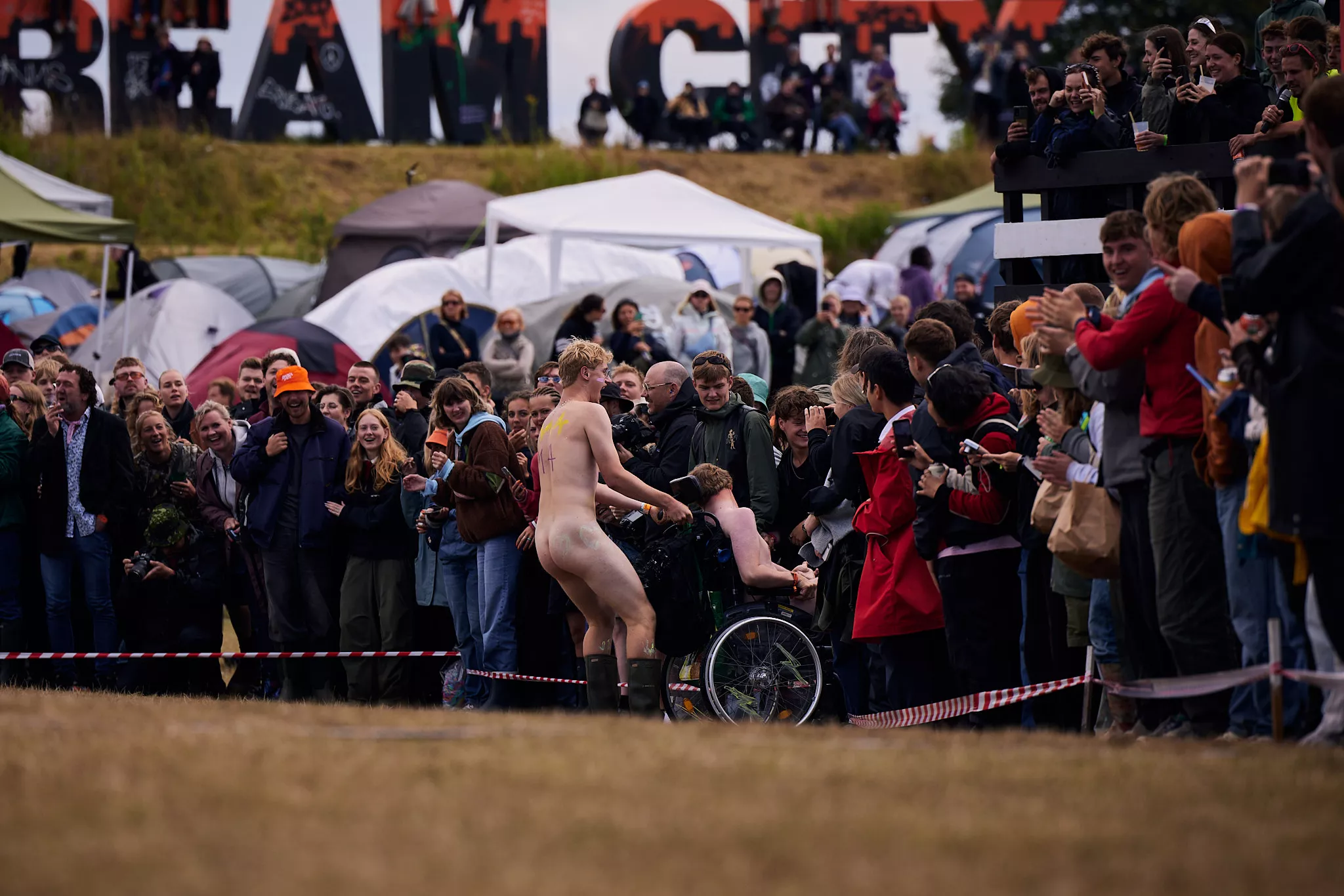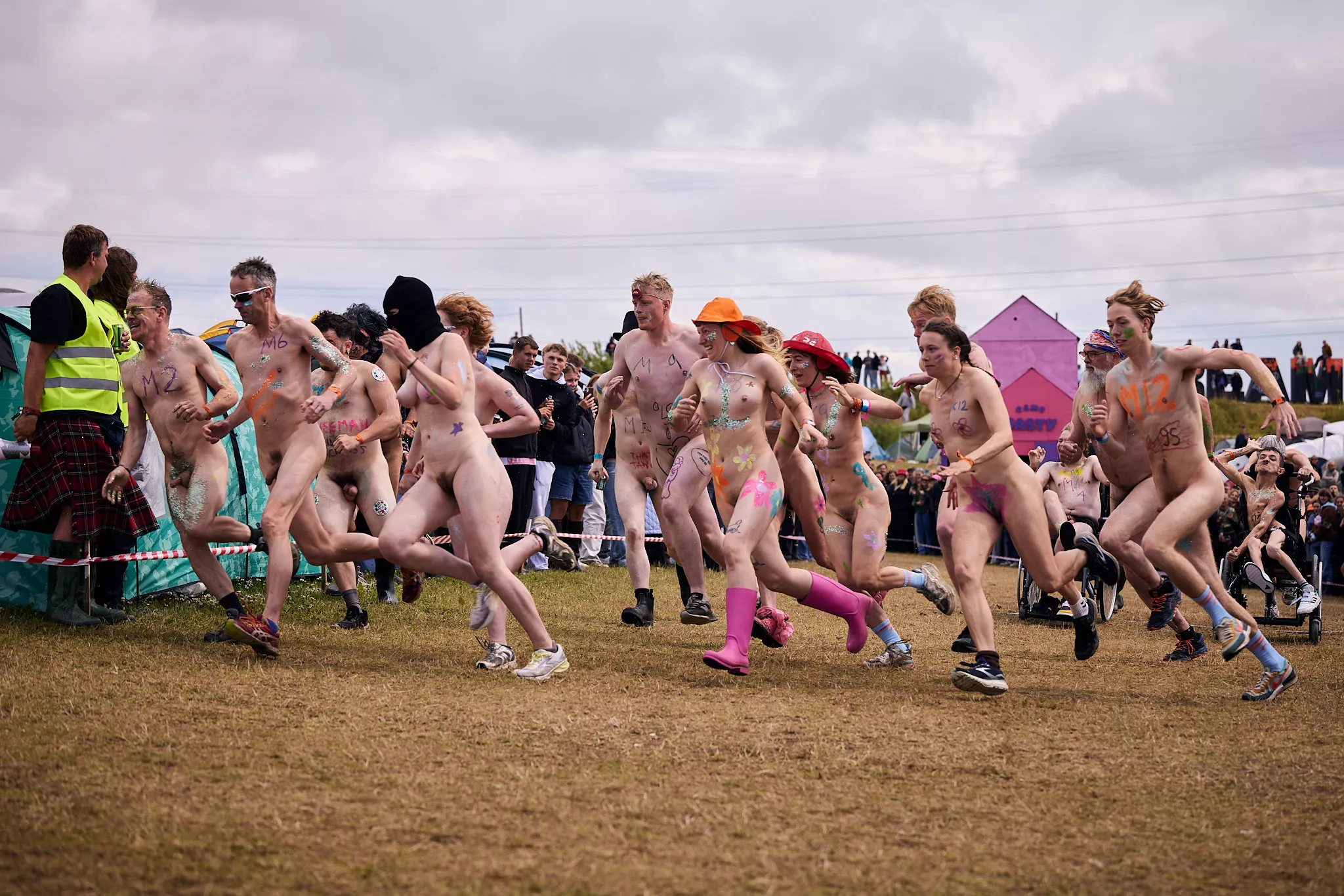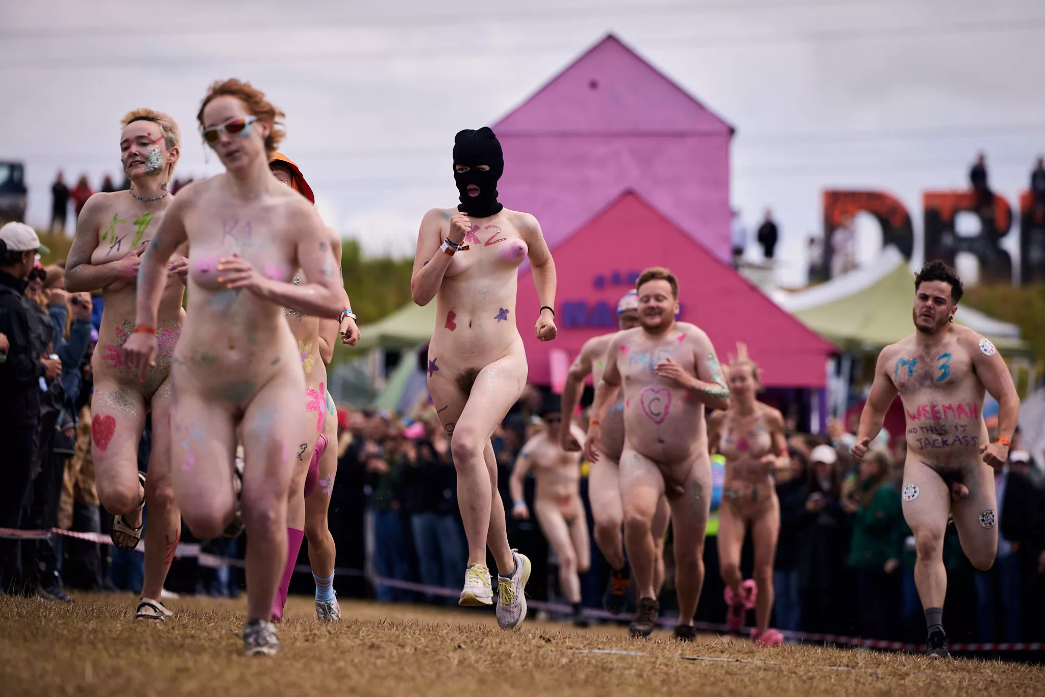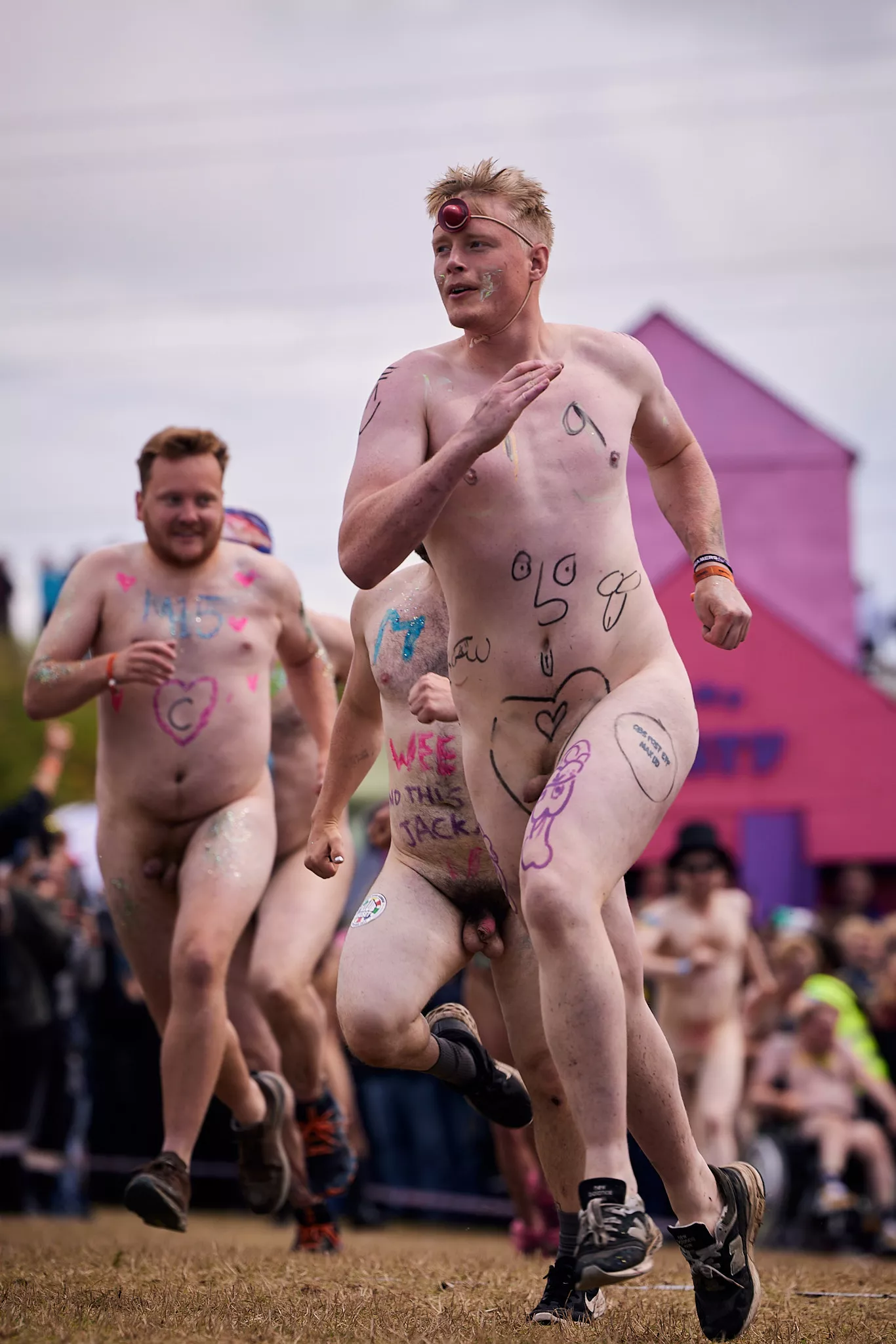 Man kunne godt frygte, at det mangeårige nøgenløb på Roskilde Festivals Dream City-område på campingarealet ville drukne i regn og mudder, da vejrguderne virkeligt har åbnet for sluserne halvanden time før starten klokken 14. Men de samme vejrguderne forbarmer sig åbenbart, for solen skinner, og løbebanen er ikke nær så tilmudret, som man kunne frygte, da klokken nærmer sig to. Fremmødet tæller adskillige hundrede, der skal se de 10 mænd, heraf to kørestolsbrugere med hjælper, og seks kvinder, der splitternøgne skal løbe rundt på den et par hundrede meter lange bane. Medieopbuddet er som vanligt stort.
