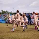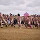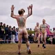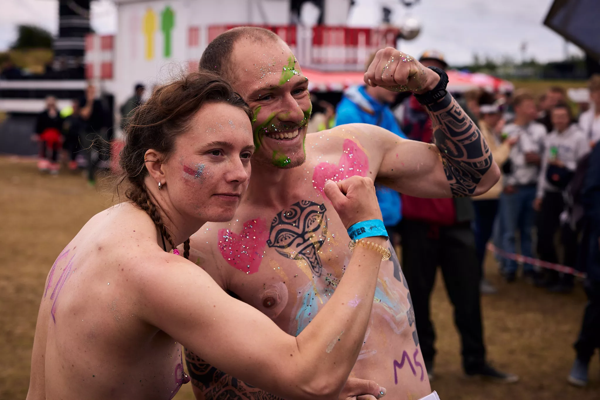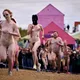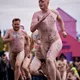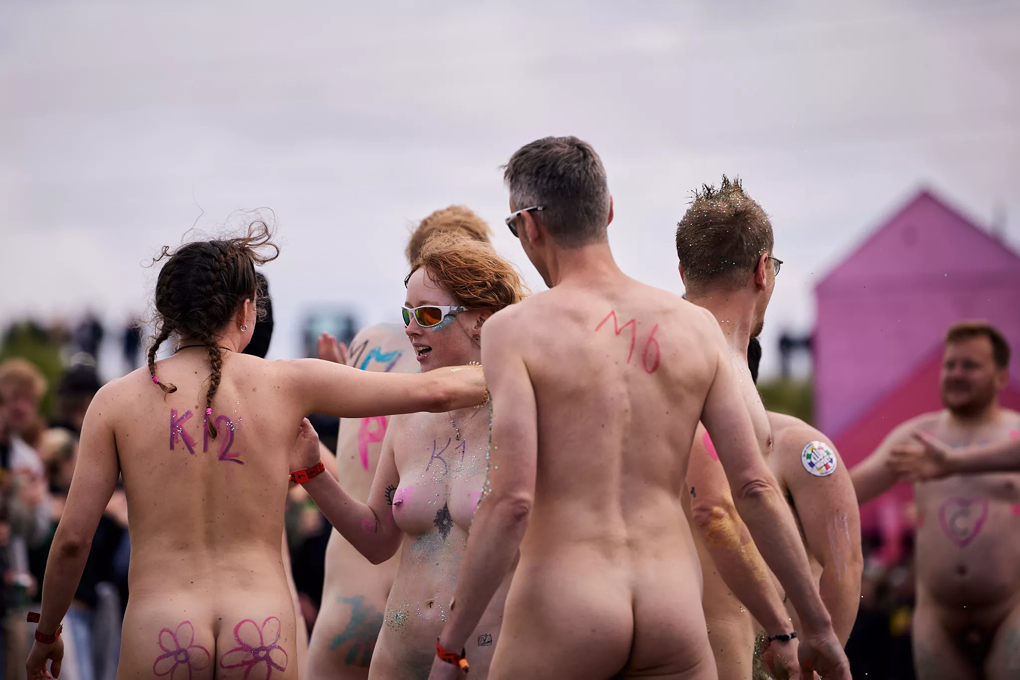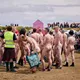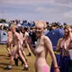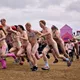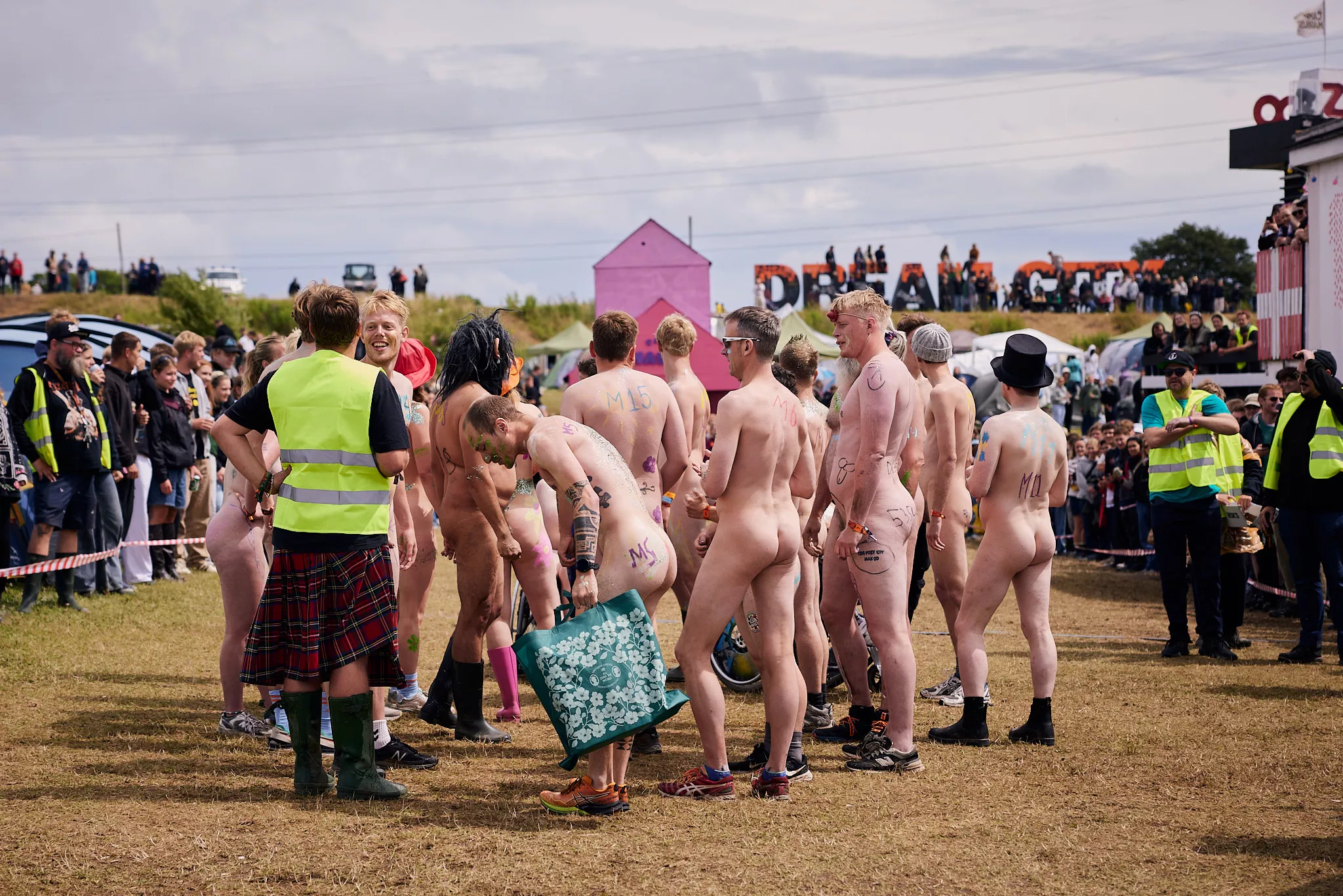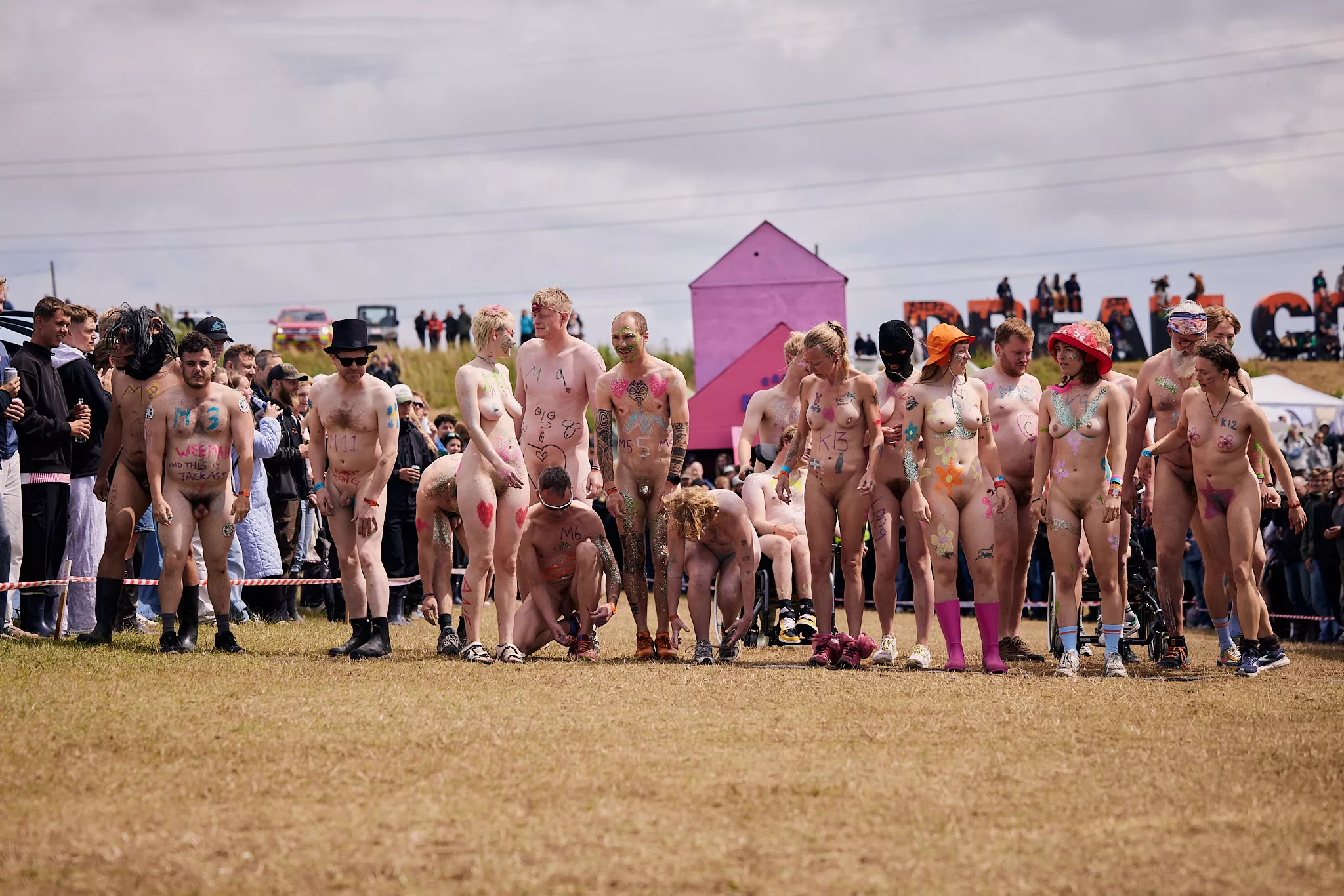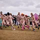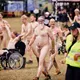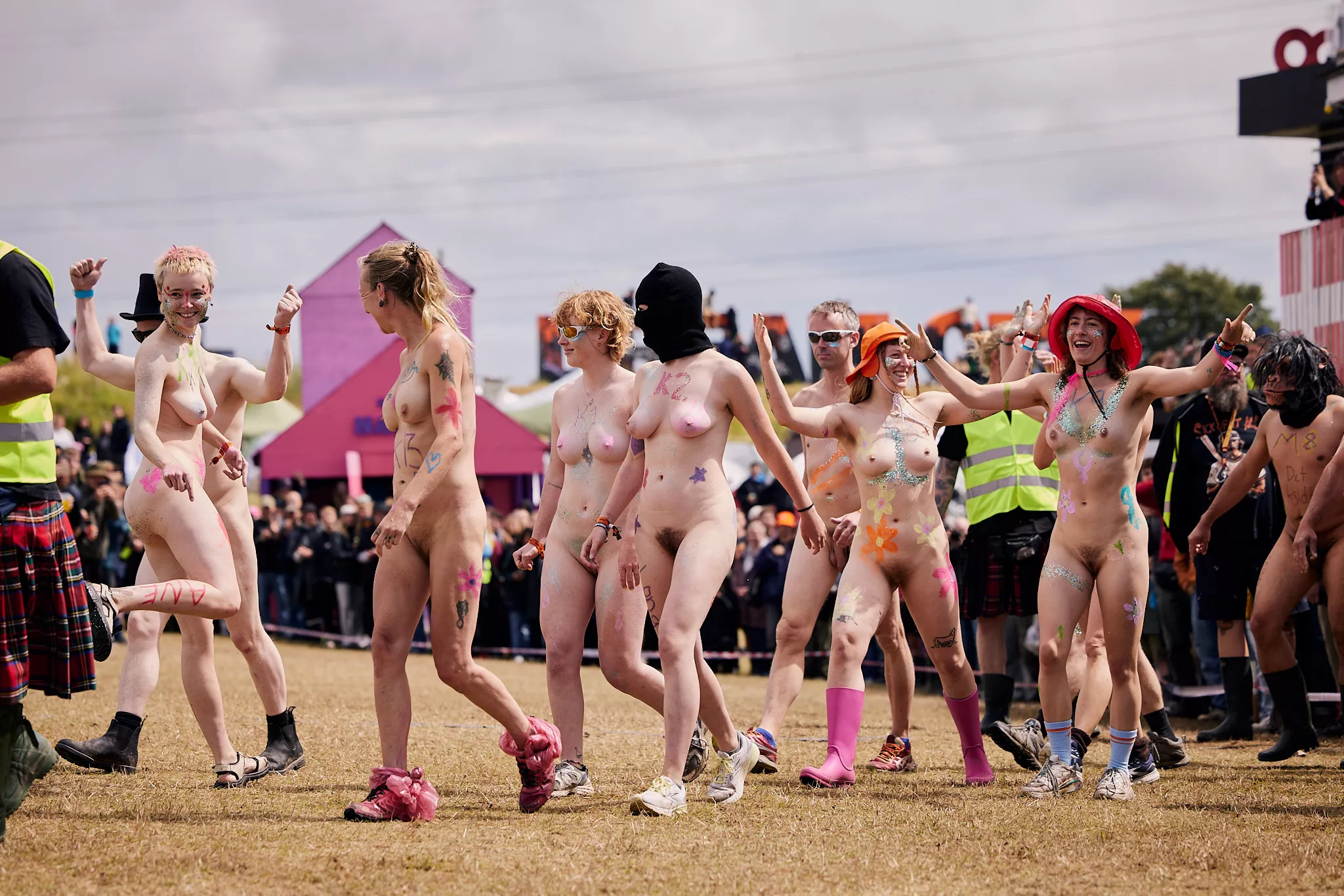 Man kunne godt frygte, at det mangeårige nøgenløb på Roskilde Festivals Dream City-område på campingarealet ville drukne i regn og mudder, da vejrguderne virkeligt har åbnet for sluserne halvanden time før starten klokken 14. Men de samme vejrguderne forbarmer sig åbenbart, for solen skinner, og løbebanen er ikke nær så tilmudret, som man kunne frygte, da klokken nærmer sig to. Fremmødet tæller adskillige hundrede, der skal se de 10 mænd, heraf to kørestolsbrugere med hjælper, og seks kvinder, der splitternøgne skal løbe rundt på den et par hundrede meter lange bane. Medieopbuddet er som vanligt stort.