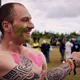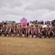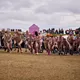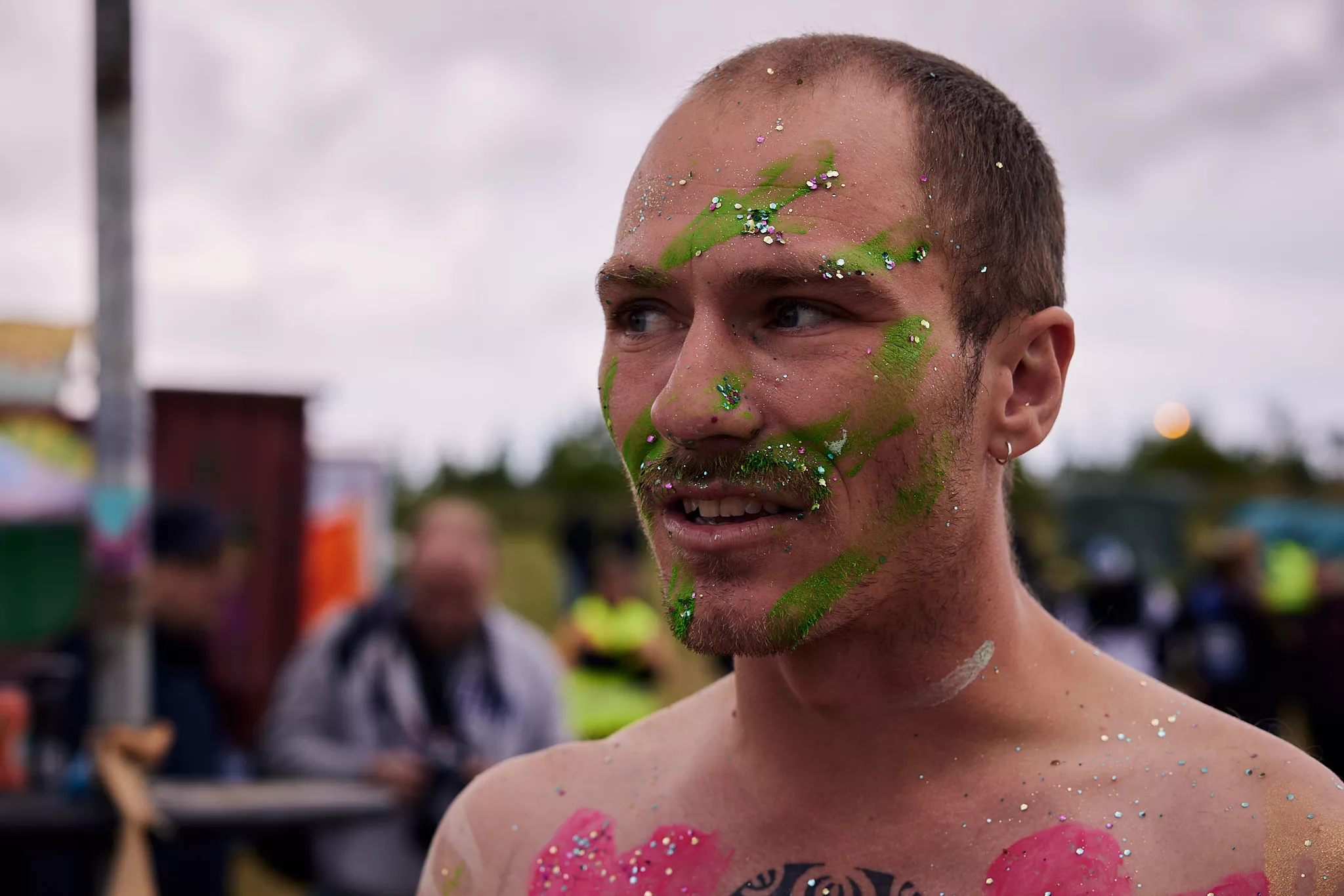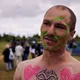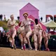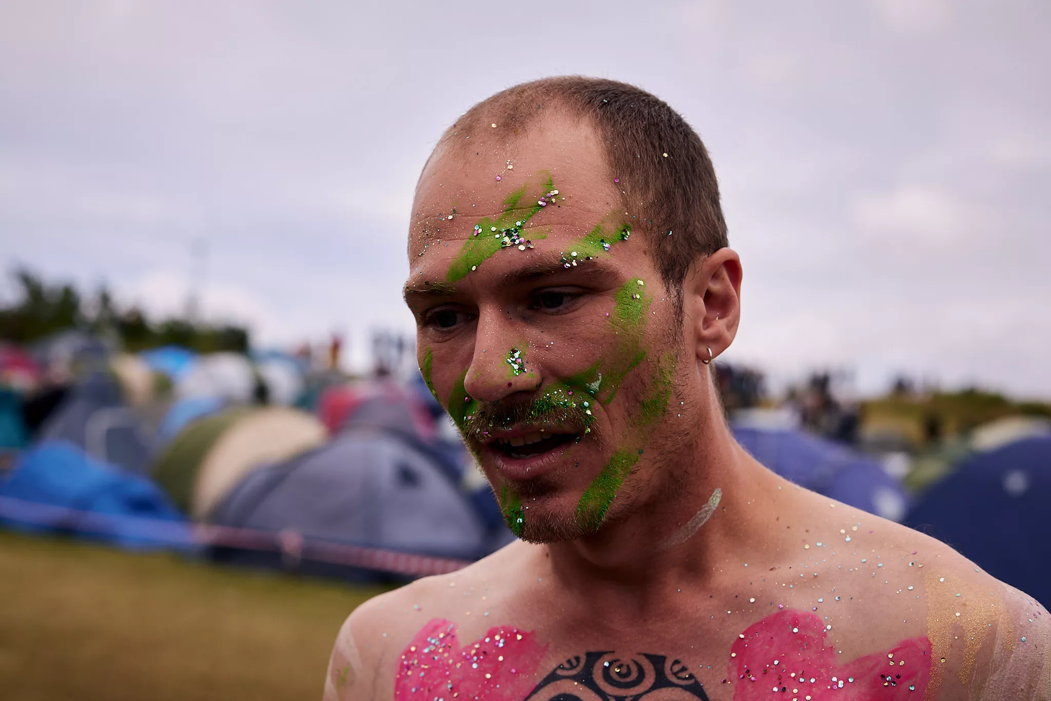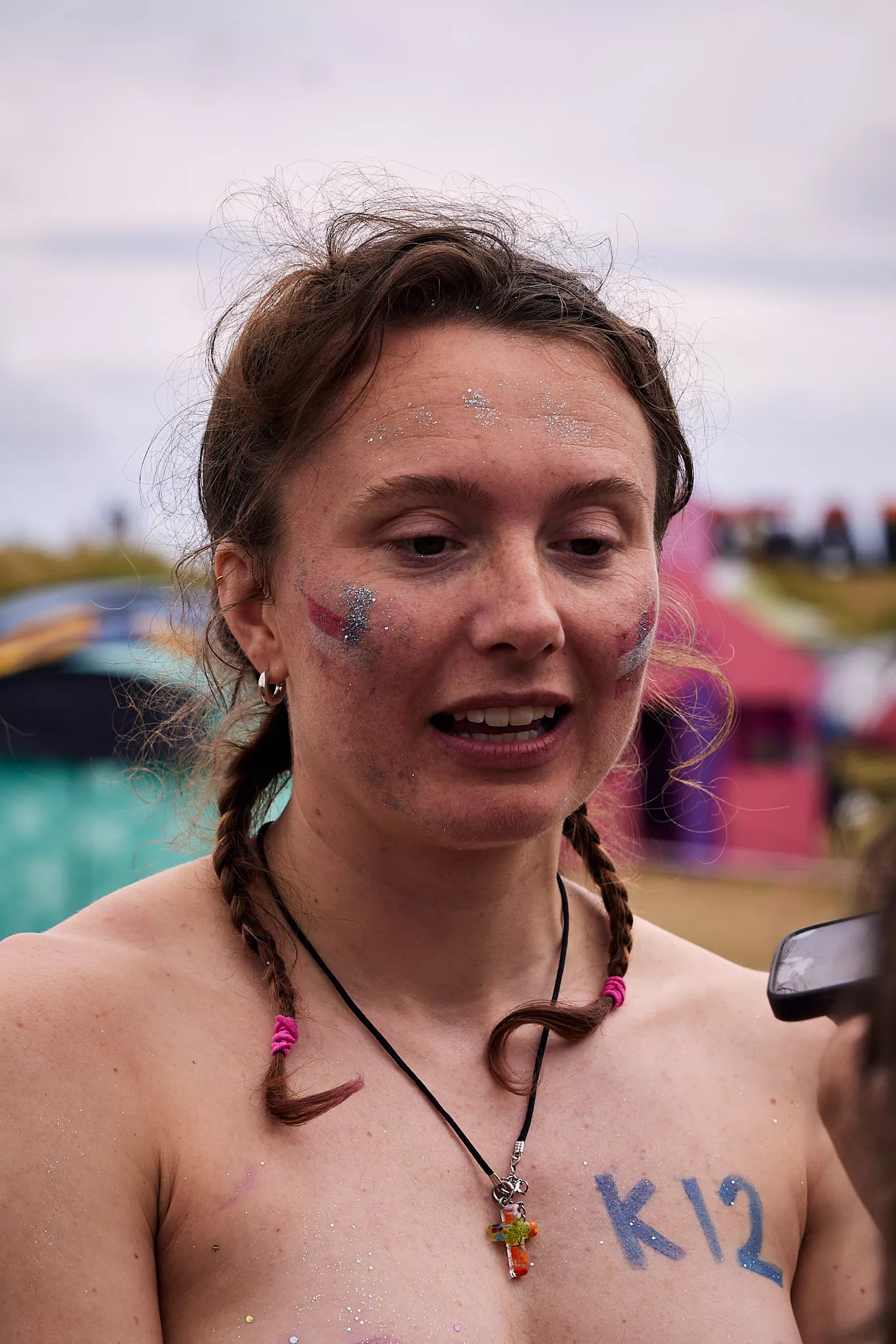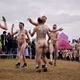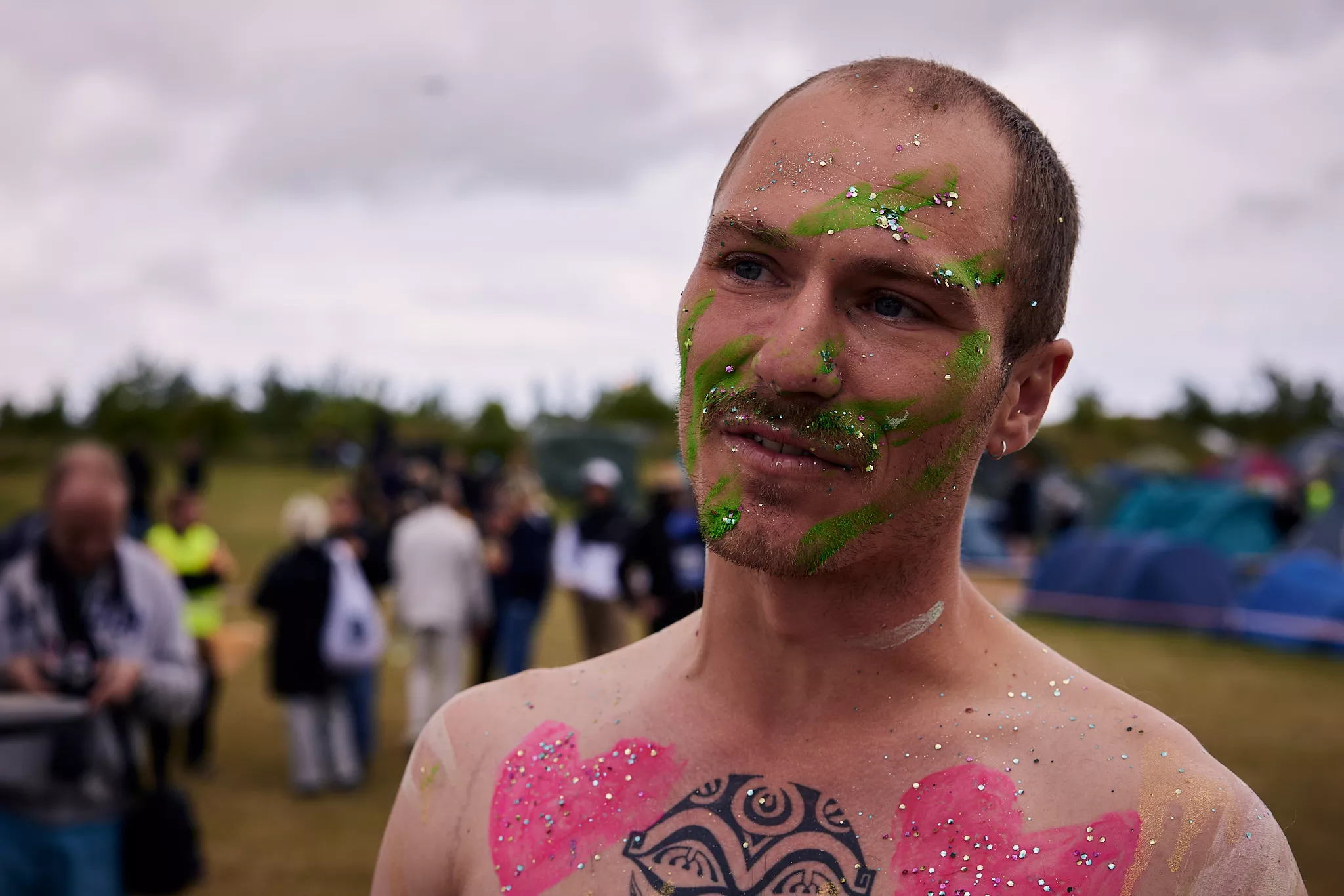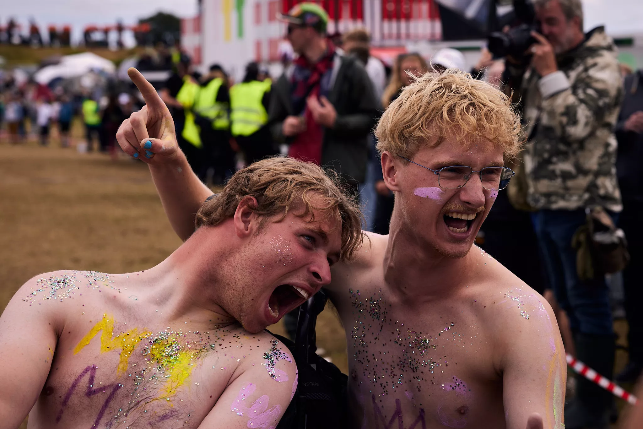 Man kunne godt frygte, at det mangeårige nøgenløb på Roskilde Festivals Dream City-område på campingarealet ville drukne i regn og mudder, da vejrguderne virkeligt har åbnet for sluserne halvanden time før starten klokken 14. Men de samme vejrguderne forbarmer sig åbenbart, for solen skinner, og løbebanen er ikke nær så tilmudret, som man kunne frygte, da klokken nærmer sig to. Fremmødet tæller adskillige hundrede, der skal se de 10 mænd, heraf to kørestolsbrugere med hjælper, og seks kvinder, der splitternøgne skal løbe rundt på den et par hundrede meter lange bane. Medieopbuddet er som vanligt stort.
