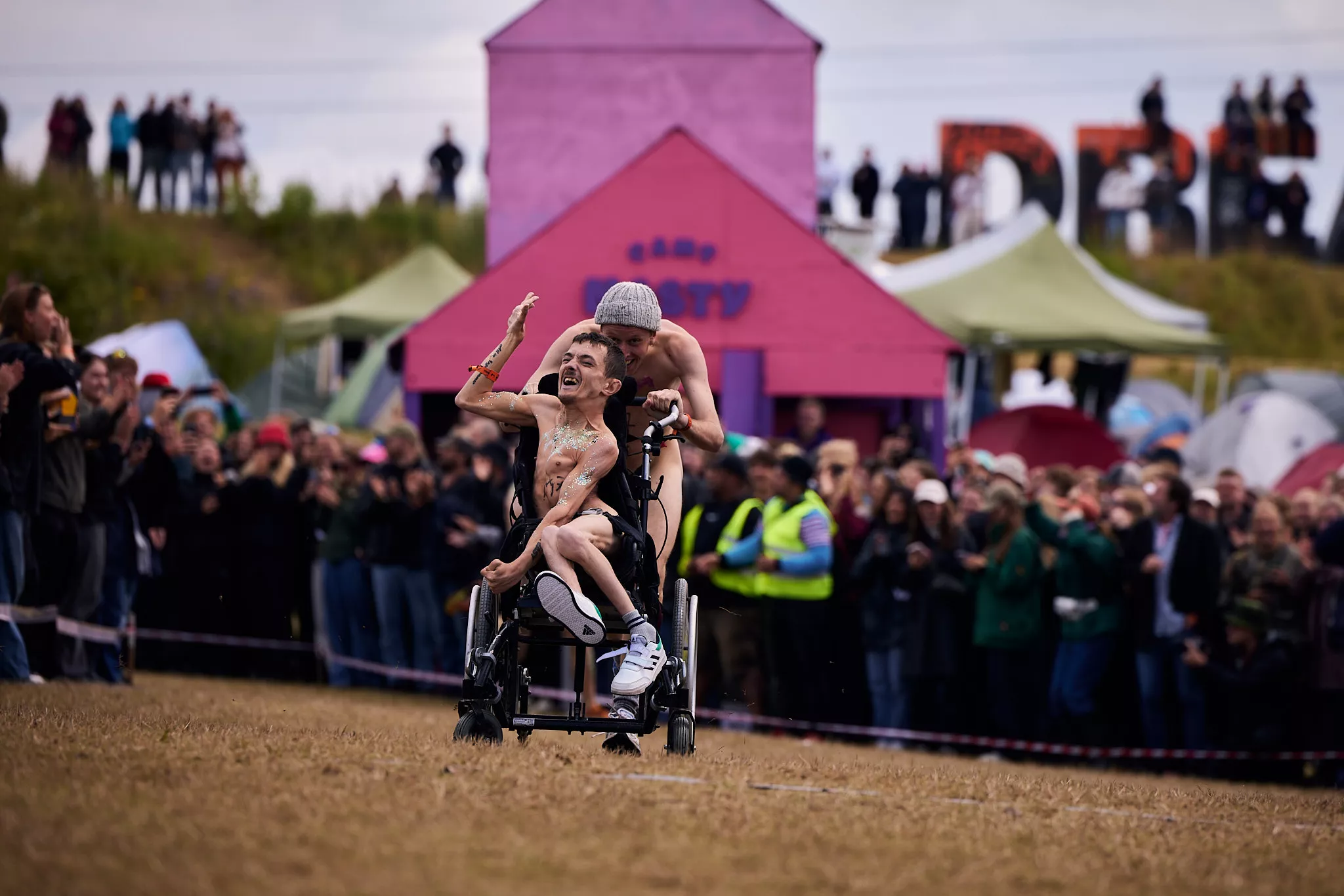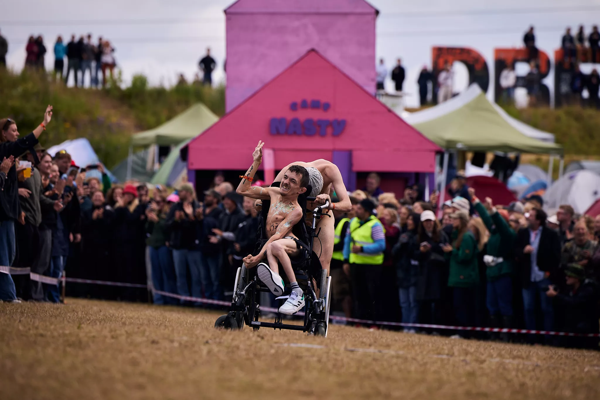 Hurtigt lægger en af mændene sig i spidsen, mens kvinderne er mere ligeværdige, og så bliver løbet ramt af et mindre uheld, da den ene af de to kørestolsbrugere skrider ud i et sving og er tæt på at ramme nogle publikummer. Der sker dog hverken person- eller materiel skade, og samme kørestolsbruger ender tilmed med at vinde sin kategori. Det er Jonas på 22 år, der har valgt at stille op for at hylde fællesskabet, og han synes, det er ”fucking fedt” – og han er klar på at stille op igen.