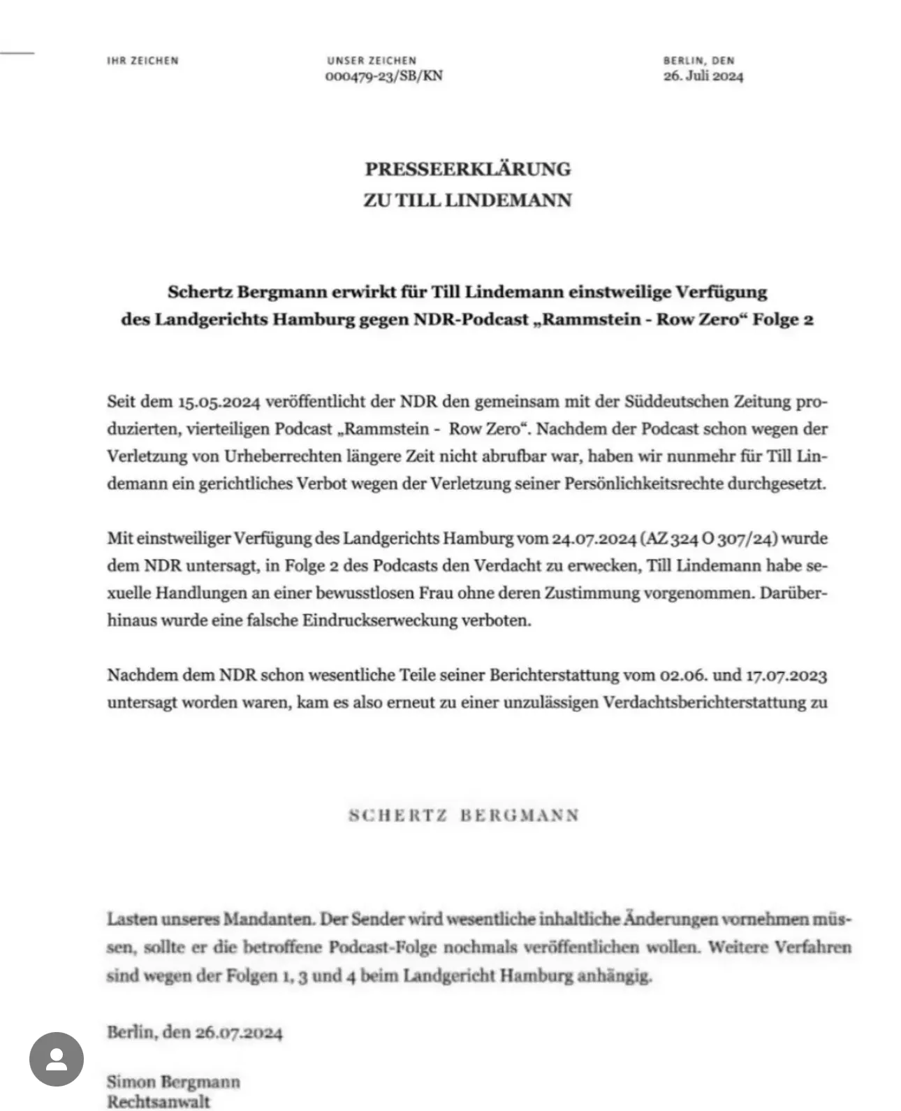 "Schertz Bergmann opnår et foreløbigt forbud for Till Lindemann fra landsretten Hamburg mod NDR podcast "Rammstein - Row Zero", episode 2