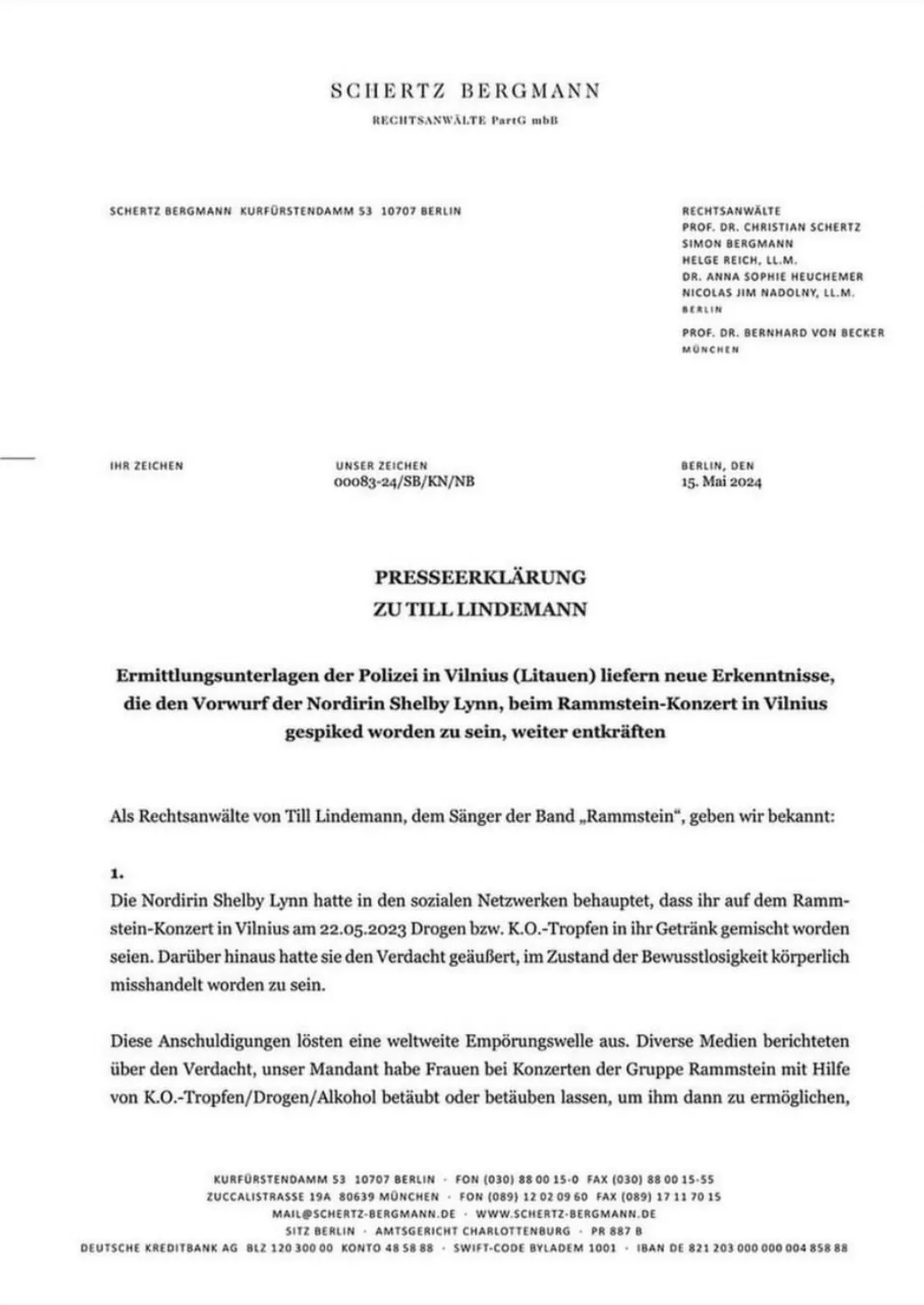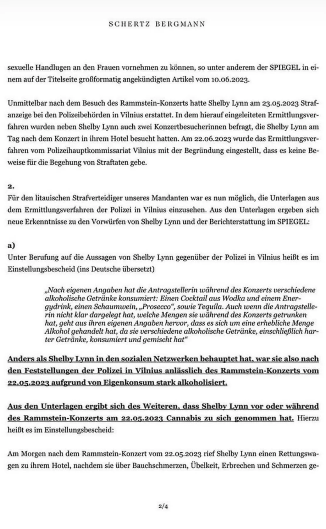 I går meddelte Till Lindemanns advokater via en pressemeddelelse, at der er nye erkendelser om Shelby Lynns beskydninger omkring koncerten i Vilnius den 22. maj 2023. I pressemeddelelsen skriver advokaterne Schertz og Bergmann, at mange af Lynns beskyldninger, for advokaterne at se, kan afkræftes yderligere, da man er kommet i besiddelse af officielle sagsdokumenter hos det litauiske politi.
