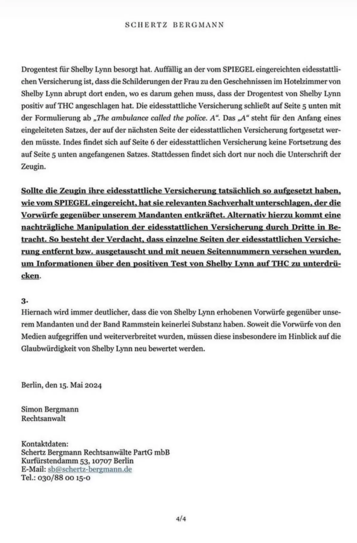 Ydermere kritiseres Lynns erklæring på tro og love over for det tyske magasin Der Spiegel, hvor Lynns påvirkning af det psykoaktive stof THC ikke nævnes, hvilket, for Lindemanns advokater at se, ændrer på sagens rette sammenhæng.