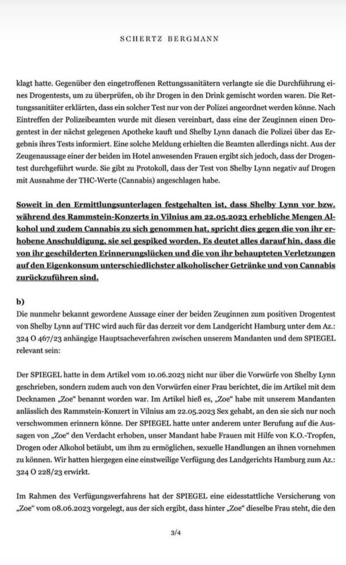 I de officielle sagsdokumenter fra det litauiske politi står, ifølge Schertz og Bergmann, blandt andet, at Shelby Lynn skulle have været cannabis-påvirket, da hun indgav sin politianmeldelse omkring at være blevet påvirket af knockoutdråber af folk hos Rammstein. Derudover har hun, efter eget udsagn, konsumeret forskelligartede alkoholiske drikkevarer til koncerten.