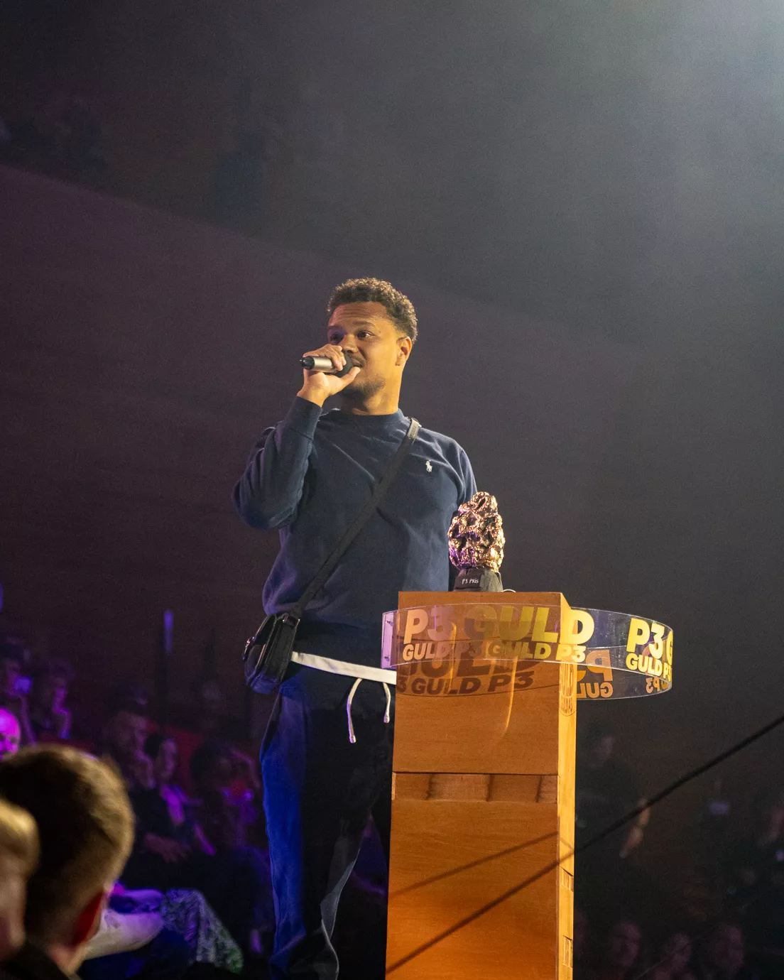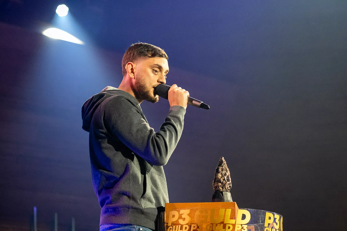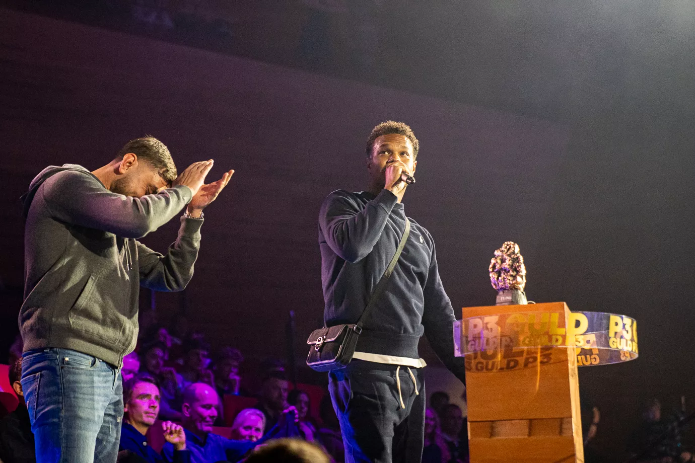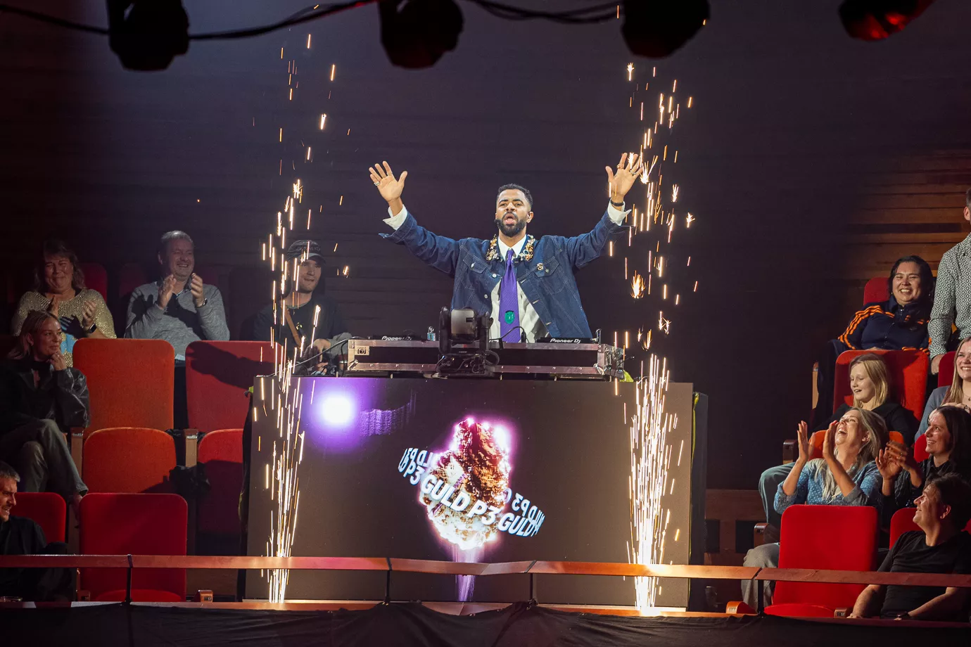 Pelle Peter Jencel varmer op som dj til P3 Guld 2024. Scenen er rund med et trommesæt i midten, og især de unge udgør majoriteten i publikum. Denne aften er dedikeret til "Danmarks vigtigste musikpris," lyder det fra Pelle Peter Jencel. Stemningen er elektrisk, og publikum er klar til en festlig aften.