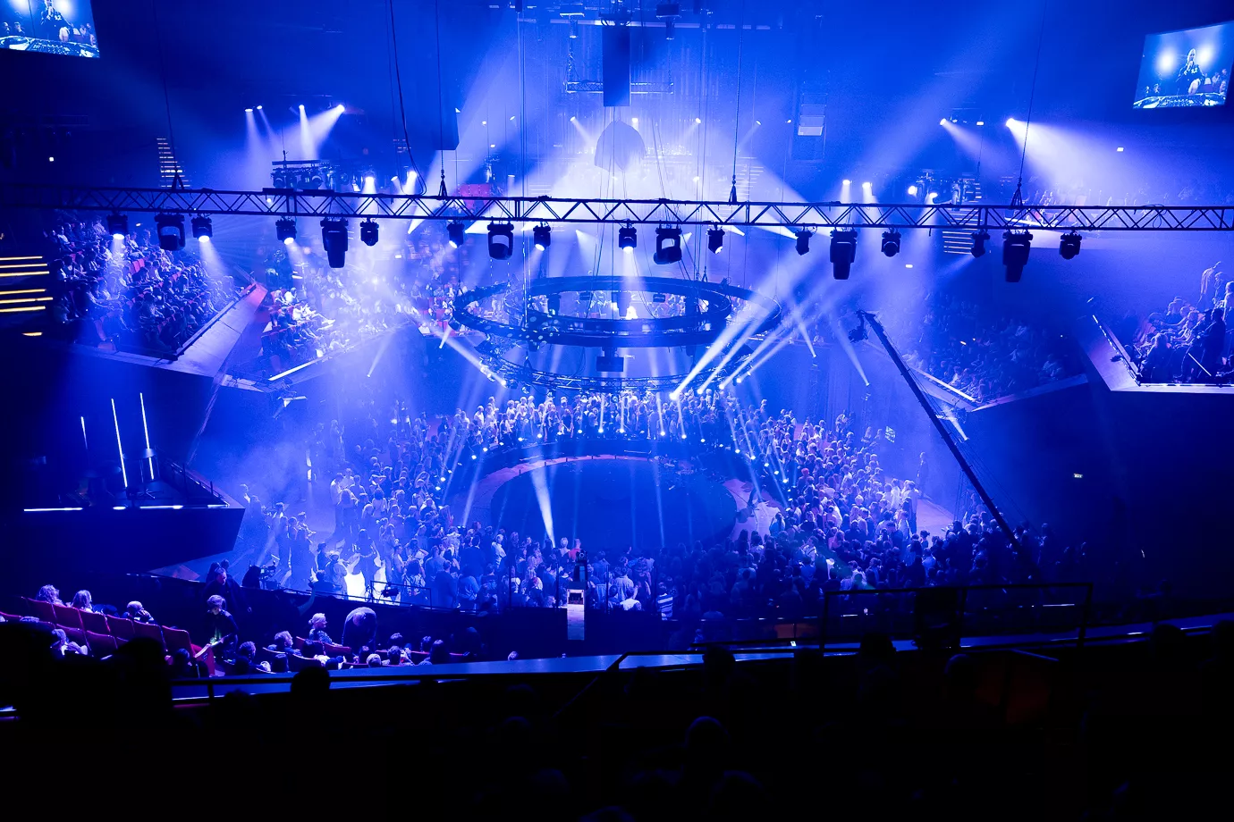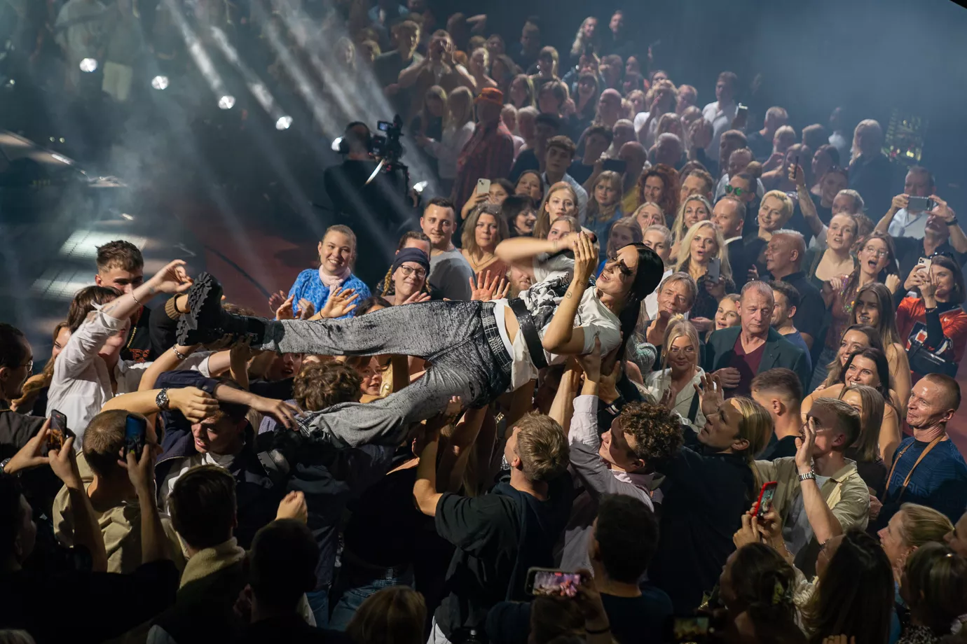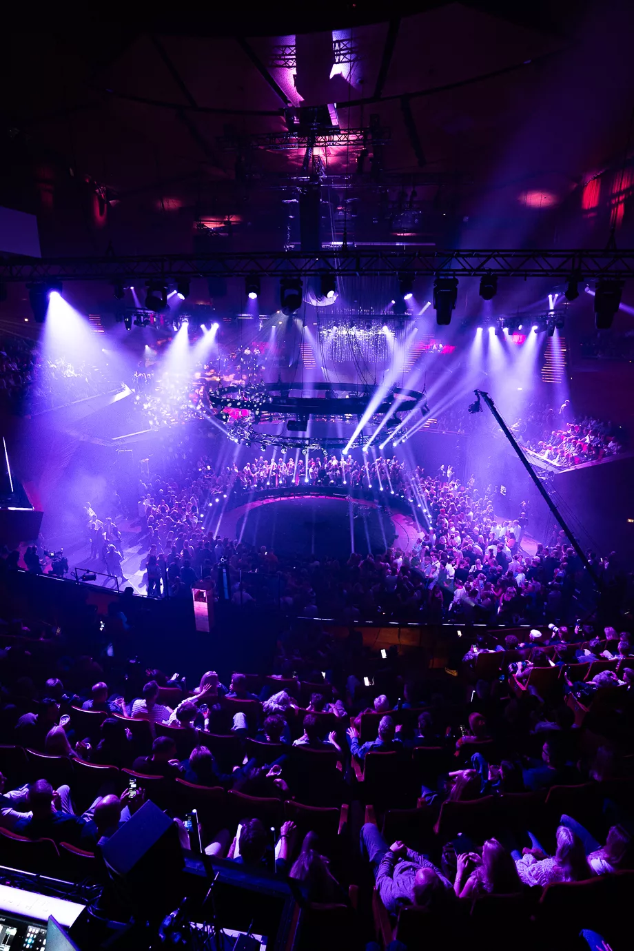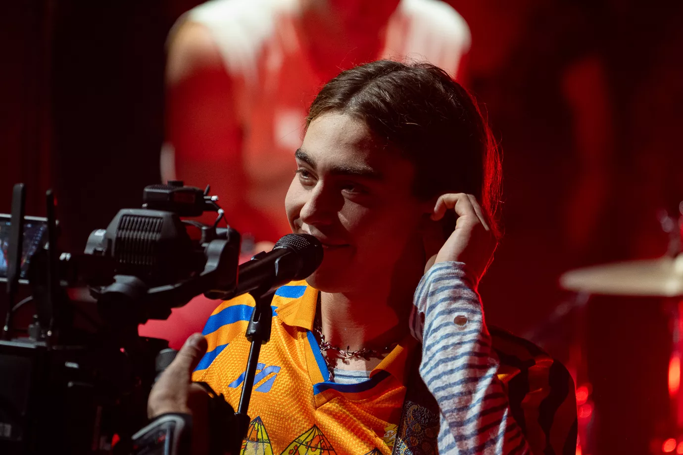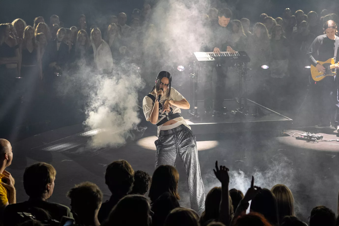 Pelle Peter Jencel varmer op som dj til P3 Guld 2024. Scenen er rund med et trommesæt i midten, og især de unge udgør majoriteten i publikum. Denne aften er dedikeret til "Danmarks vigtigste musikpris," lyder det fra Pelle Peter Jencel. Stemningen er elektrisk, og publikum er klar til en festlig aften.