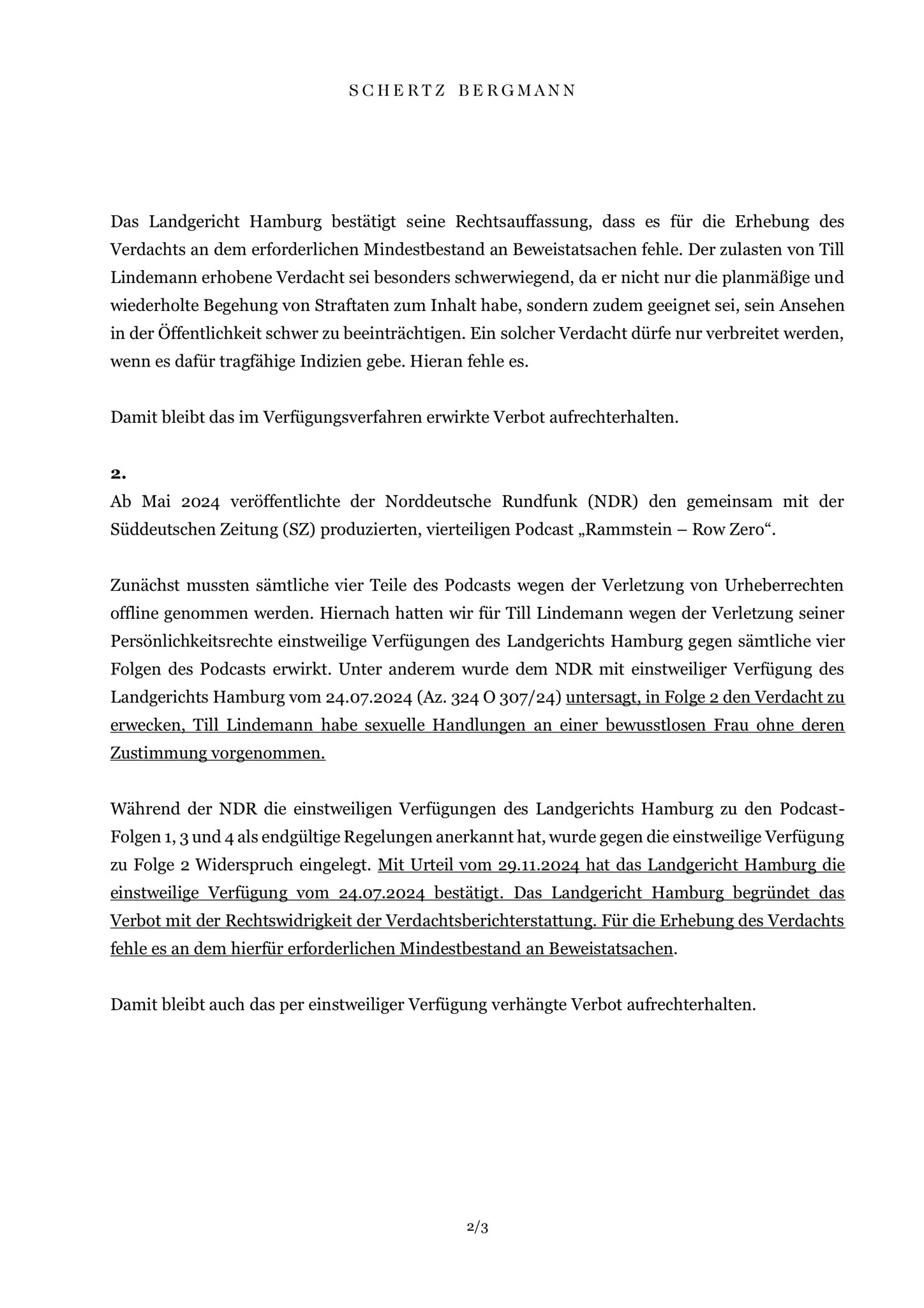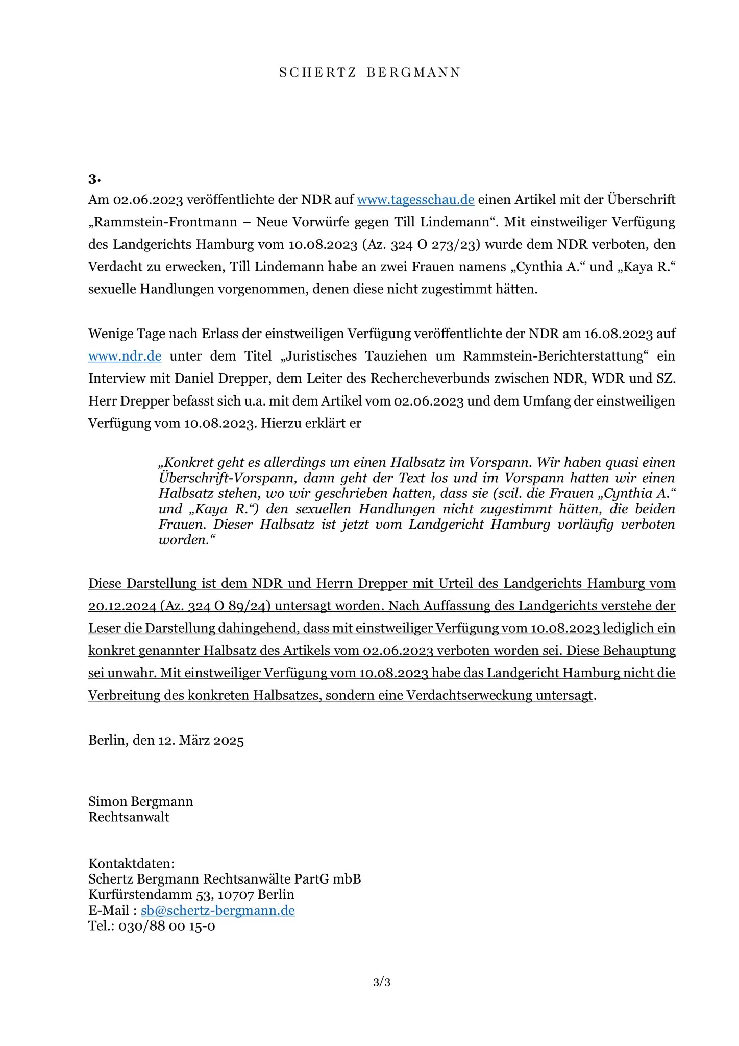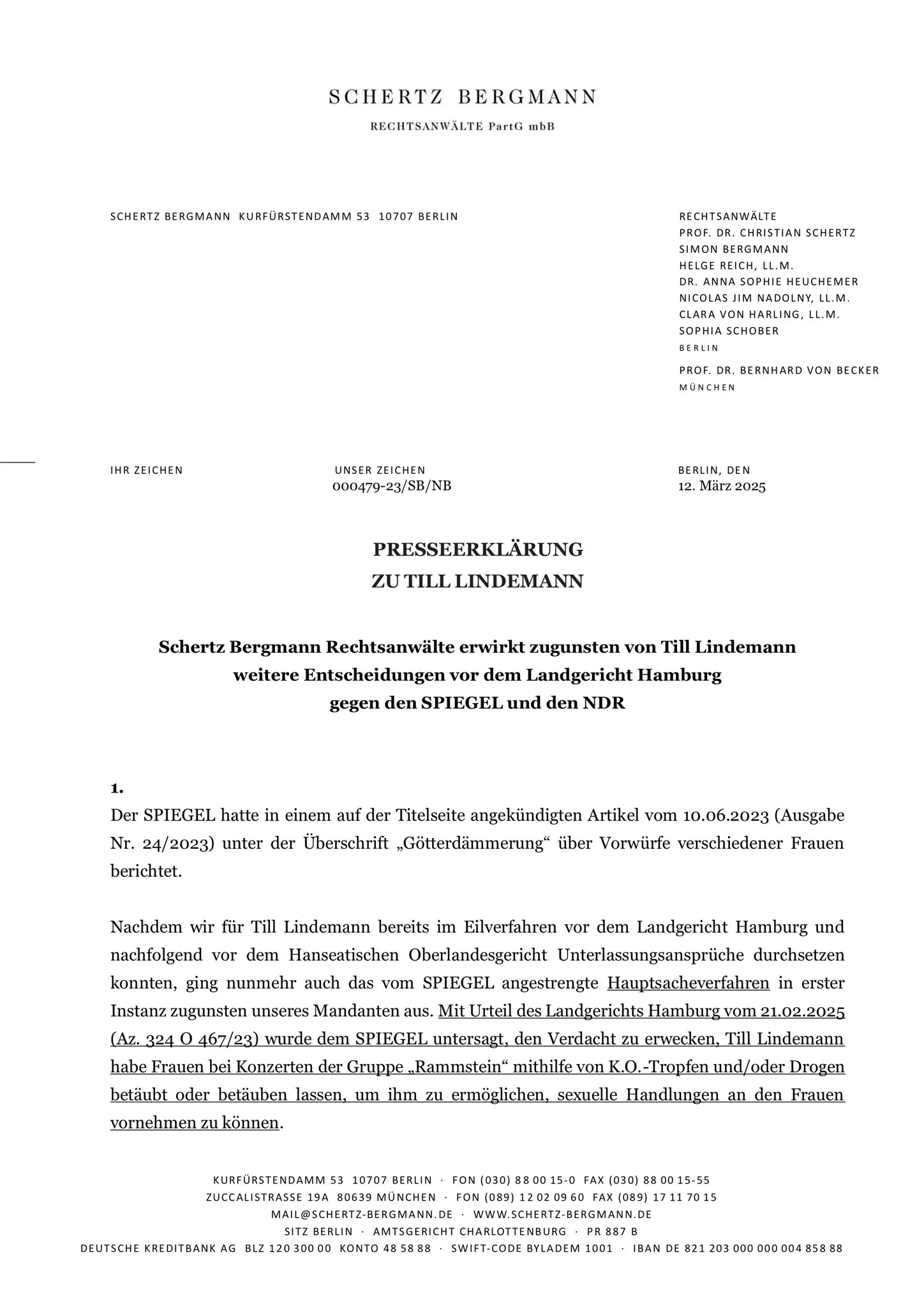 I en pressemeddelelse dateret onsdag den 12. marts 2025 kommenterede Till Lindemanns advokat Simon Bergmann fra advokatfirmaet Schertz & Bergmann endnu en gang Lindemann-sagen. Det drejer sig om forskellige sejre i retten til fordel for Lindemann. Frem for alt henviser Bergmann i udtalelsen, som nu også er blevet offentliggjort på nyhedstjenesten X, til en kendelse fra Hamburgs regionale domstol af 21. februar 2025.