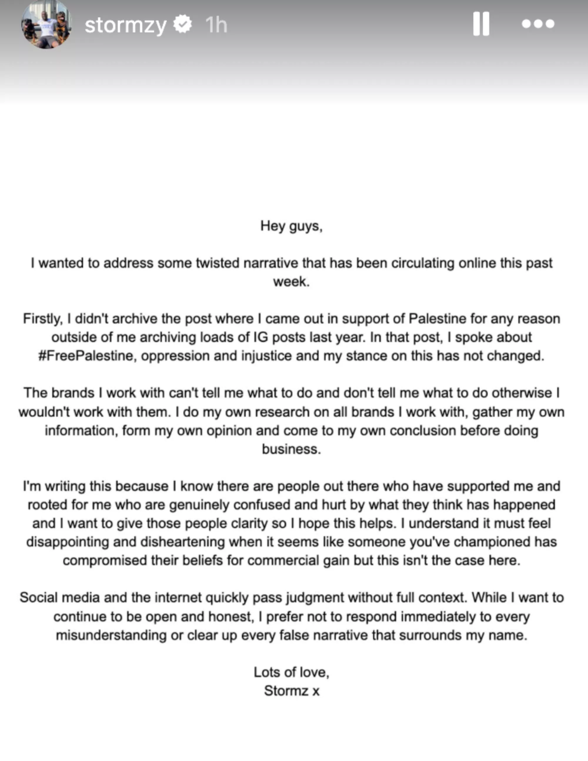 I et opslag på Instagram den 21. februar tager Stormzy afstand fra beskyldningerne. “Jeg arkiverede ikke opslaget, fordi jeg ændrede holdning, men fordi jeg sidste år arkiverede en række opslag på Instagram,” forklarer han. Han understreger, at hans holdning til “#FreePalestine, undertrykkelse og uretfærdighed” er uændret.