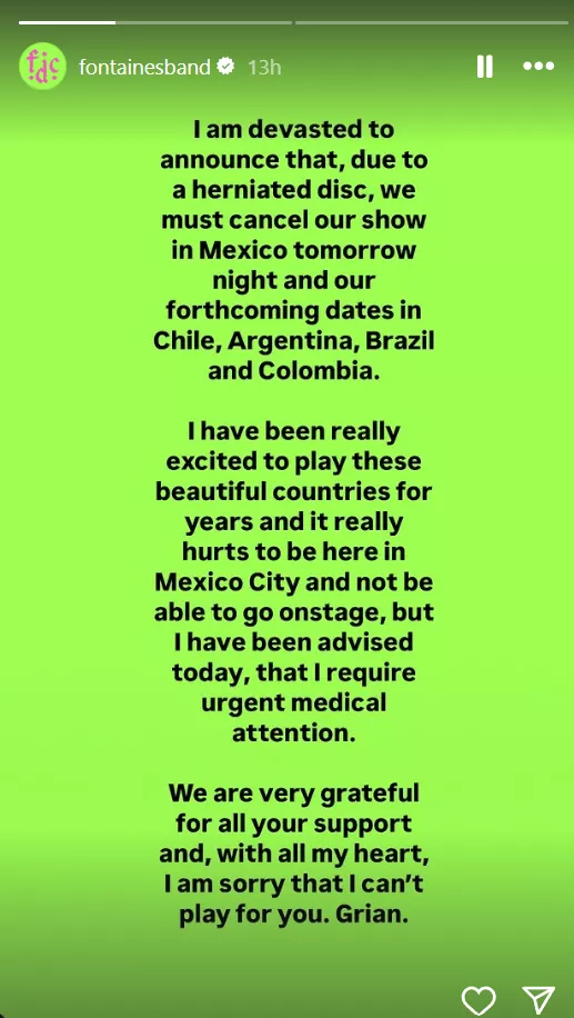 Den irske post-punk gruppe Fontaines D.C. har meddelt, at de aflyser flere koncerter i Sydamerika. Aflysningen skyldes, at forsanger Grian Chatten har pådraget sig en diskusprolaps og har brug for "akut medicinsk behandling." Det bekræfter Chatten selv i en udtalelse på bandets officielle Instagram-profil.