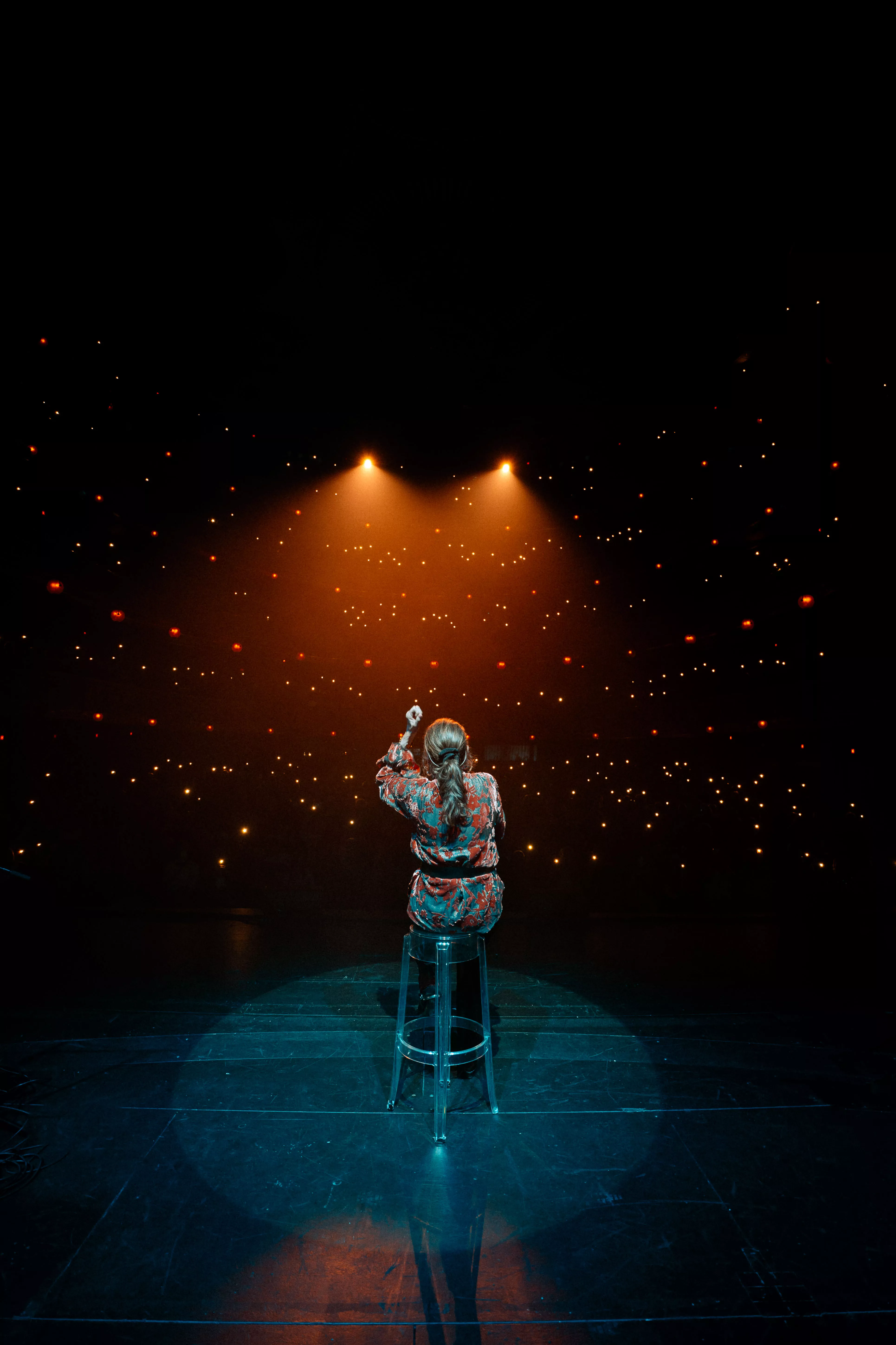 Vi gik videre til om aftenen, få minutter før showet begyndte, hvor jeg kom forbi hende stående alene i mørket, med kun et blødt blåt lys omkring sig, og hvor hun fik et øjeblik for sig selv til at trække vejret og blive klar mentalt. Dagen sluttede med hende foran et fyldt teater med lysene tændt, omringet af kærlighed fra publikum.