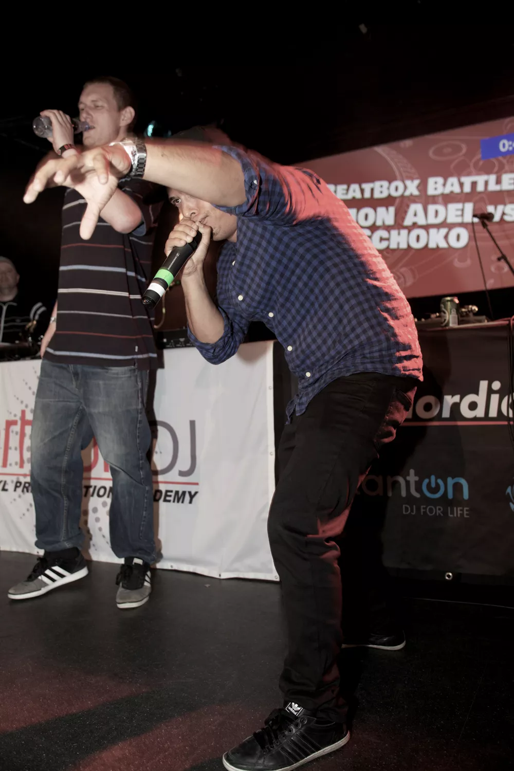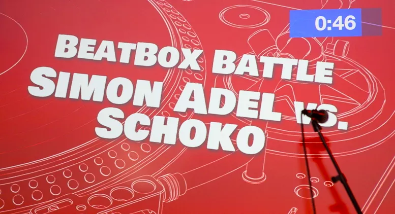 Battlen mellem beatboxerne Simon Adel og Schoko viste overlegenhed, originalitet og showmanship på et niveau, som hverken undertegnede eller Jay-B tilsyneladende før havde set. Adels dybe bas-toner, langsomme rytmik og helt ustyrligt fede dupstep-filterbas-efterligning fik nogle af aftenens højeste applauser. Schokos stil var hurtig og stram som et tæt programmeret 2-step-beat, og han havde en unik artikulation af lilletromme/handclap-samples, hvor munden som lydkilde kun kunne accepteres gennem en førstehånds øjenvidneberetning.