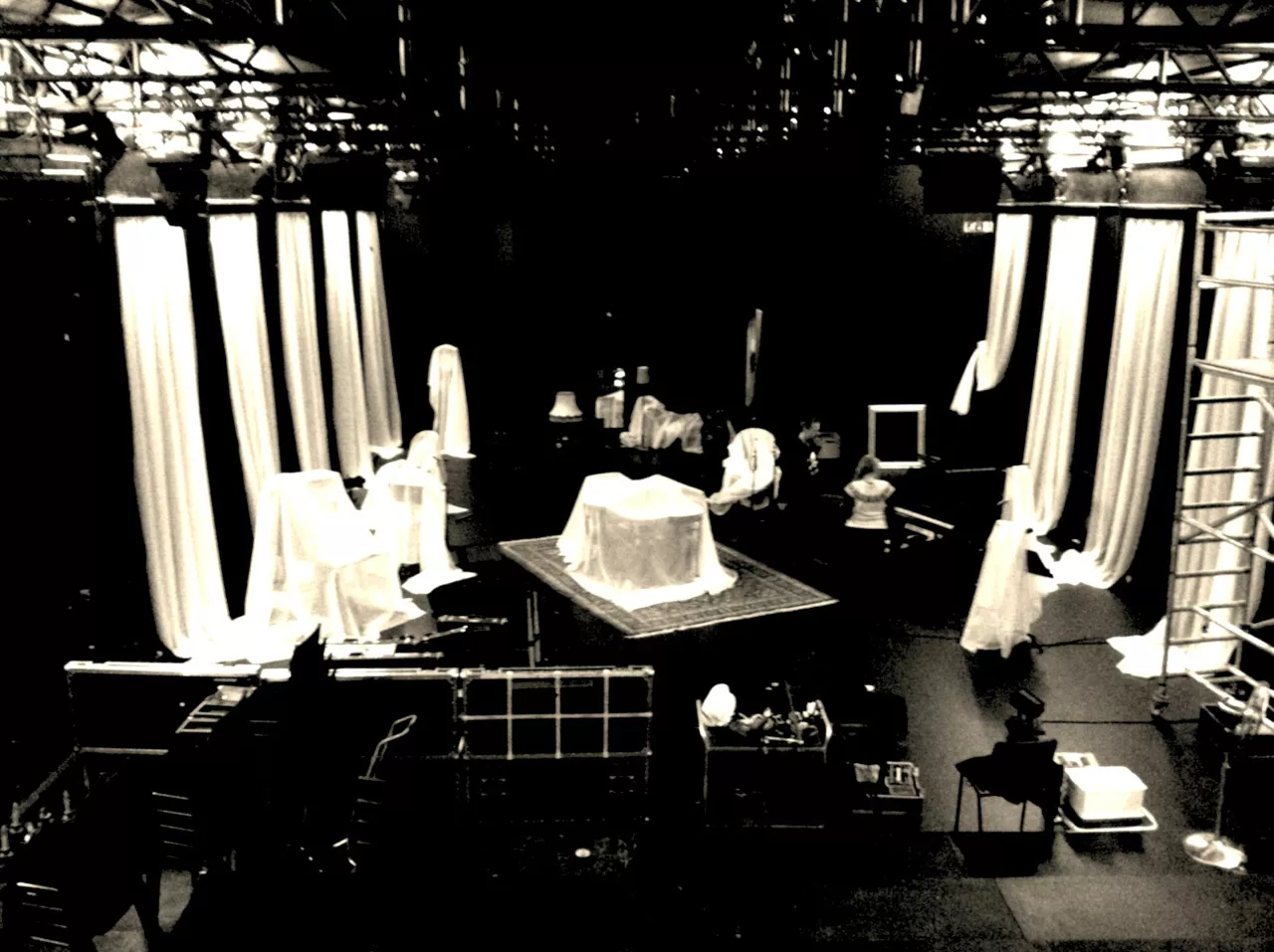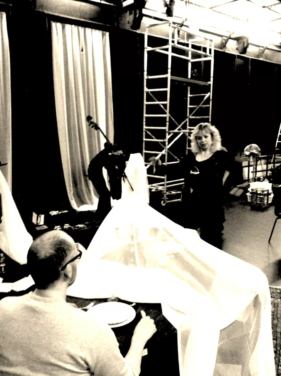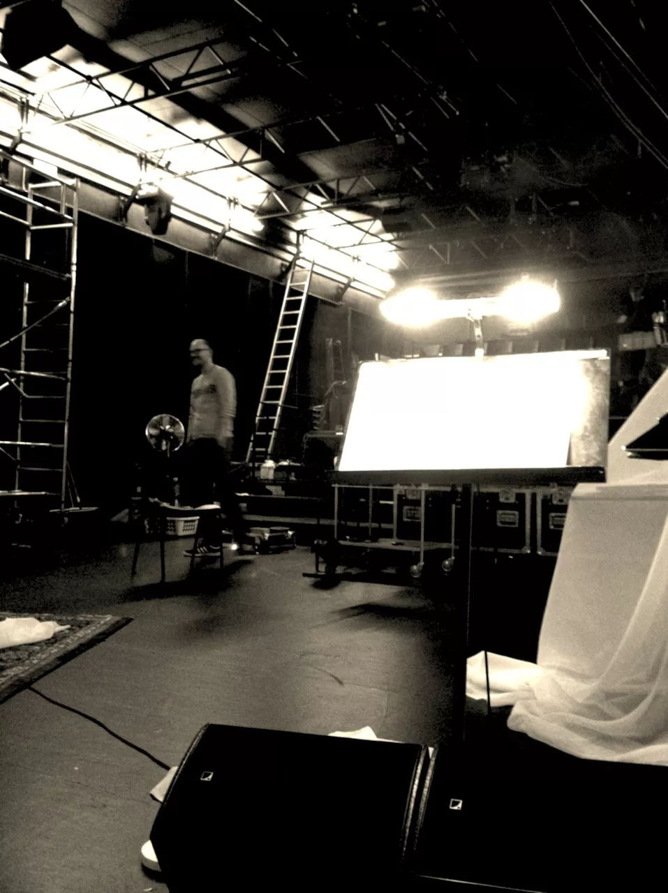 Teatersalen oser af produktion, og det fyger med mennesker som i flere dage har gået og forberedt kulisser, lyd, video og lys. I dag er helliget lyden og musikken, bistået af vores musikalske instruktør og teatrets far Allan Klie. Vi får hilst på hele holdet og taget vældig godt imod. Stedets lydmand viser sig at være noget af en wizard, som både kan forstå alle vores mystiske krav samt trylle diverse løsninger frem med et smil. På godt halvanden time får vi stillet vores udstyr op, lavet lyd og ødelagt scenografien. Undervejs vimser der pludselig en trind lille sag rundt og øver håndstand??? Det må være hende Julia som jeg ifølge manuskriptet skal kysse med i scene 7, og som jeg nu glæder mig frygteligt meget til at skulle tage om flere gange.
