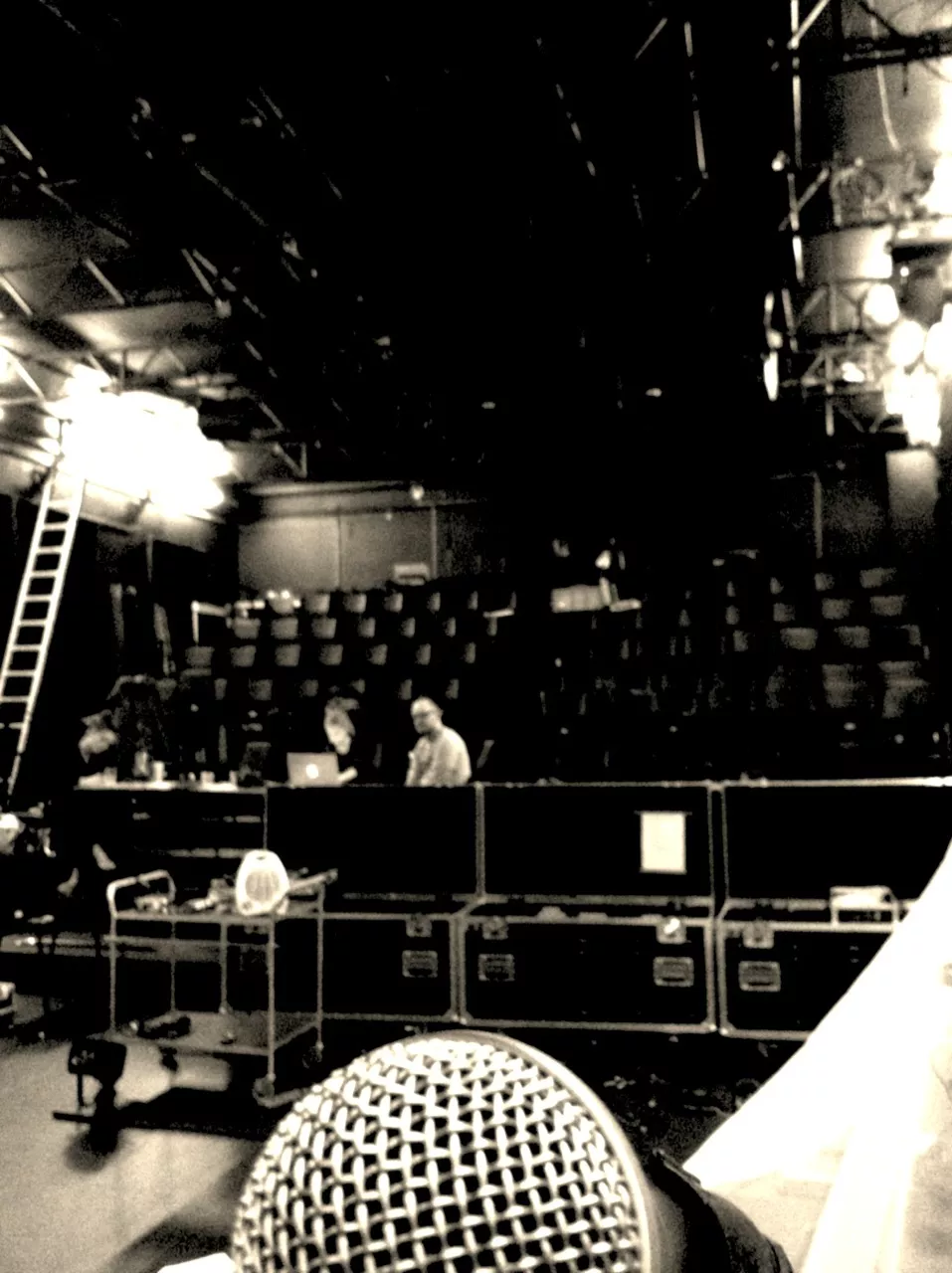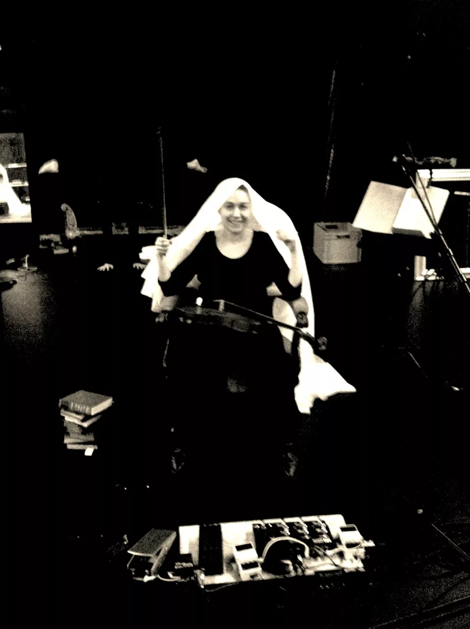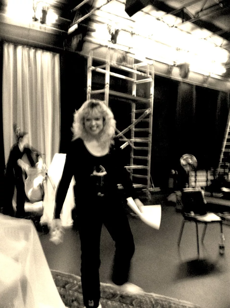 Teatersalen oser af produktion, og det fyger med mennesker som i flere dage har gået og forberedt kulisser, lyd, video og lys. I dag er helliget lyden og musikken, bistået af vores musikalske instruktør og teatrets far Allan Klie. Vi får hilst på hele holdet og taget vældig godt imod. Stedets lydmand viser sig at være noget af en wizard, som både kan forstå alle vores mystiske krav samt trylle diverse løsninger frem med et smil. På godt halvanden time får vi stillet vores udstyr op, lavet lyd og ødelagt scenografien. Undervejs vimser der pludselig en trind lille sag rundt og øver håndstand??? Det må være hende Julia som jeg ifølge manuskriptet skal kysse med i scene 7, og som jeg nu glæder mig frygteligt meget til at skulle tage om flere gange.