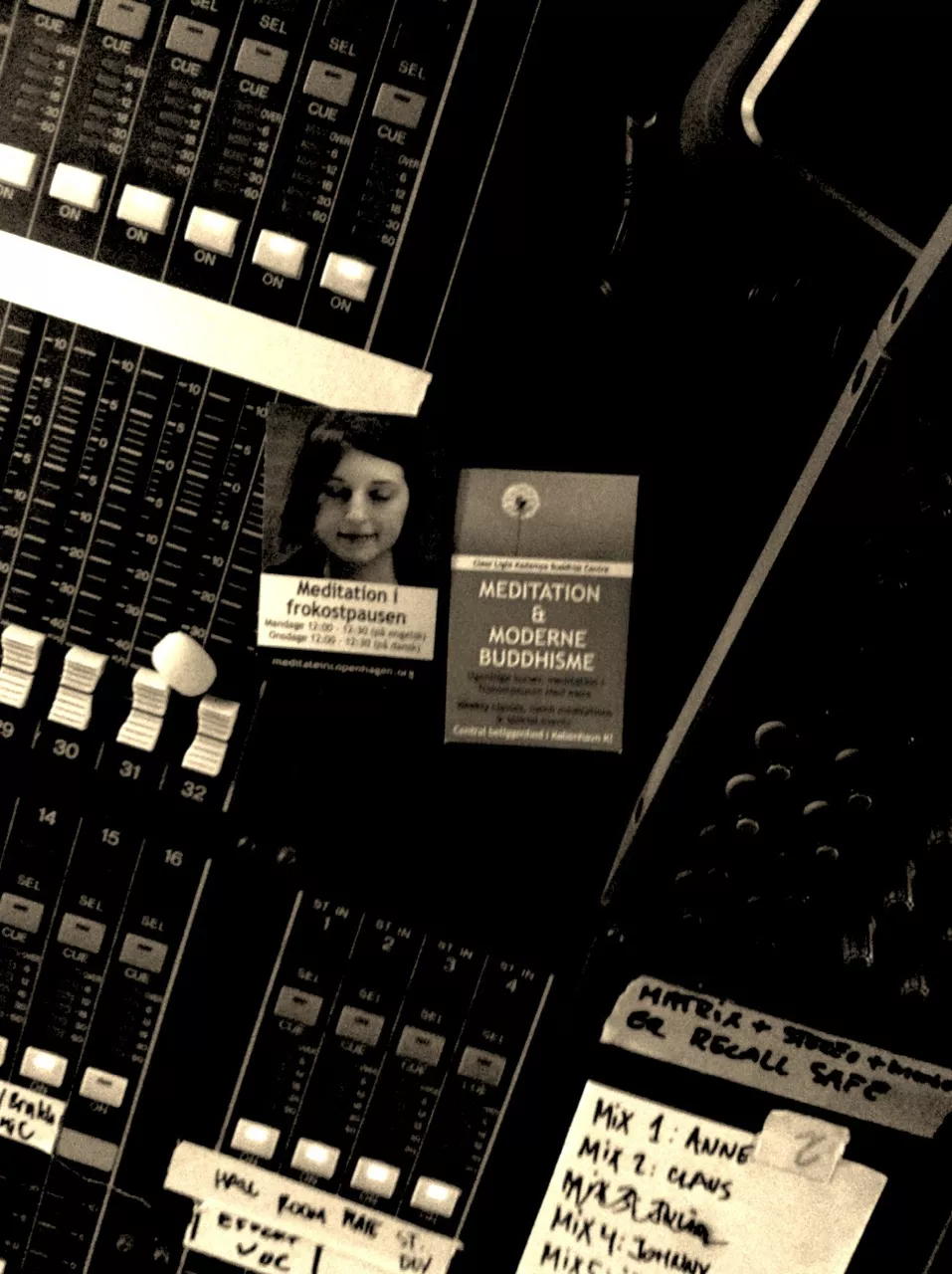 Undervejs i gennemspilning oplever vi alle et eller andet som skal rettes ind. Det kan typisk være alt fra tøjskift til reaktion på rette replik. Ofte kan man tænke alt fungerer og intet kan ramme en, for så lige pludselig at vende, som skrevet i alverdens religionsforstyrrede bøger. Siden jeg i går hånede lydguru Fader Erik for hans fortalen for hippie-stenaldermad med efterfølgende slige trang og falden i slikpusherens ubarmhjertige fælde, har stemningen ikke været den samme. På hans mixerpult opdager jeg et par reklamevisitkort der afslører at han overvejer buddhistisk meditation oven på disse ongoing hårde strabadser med "Bodega Trio & Die AA".