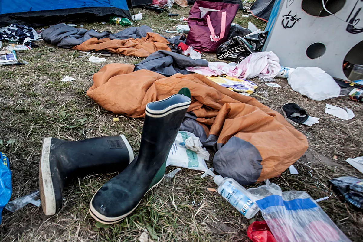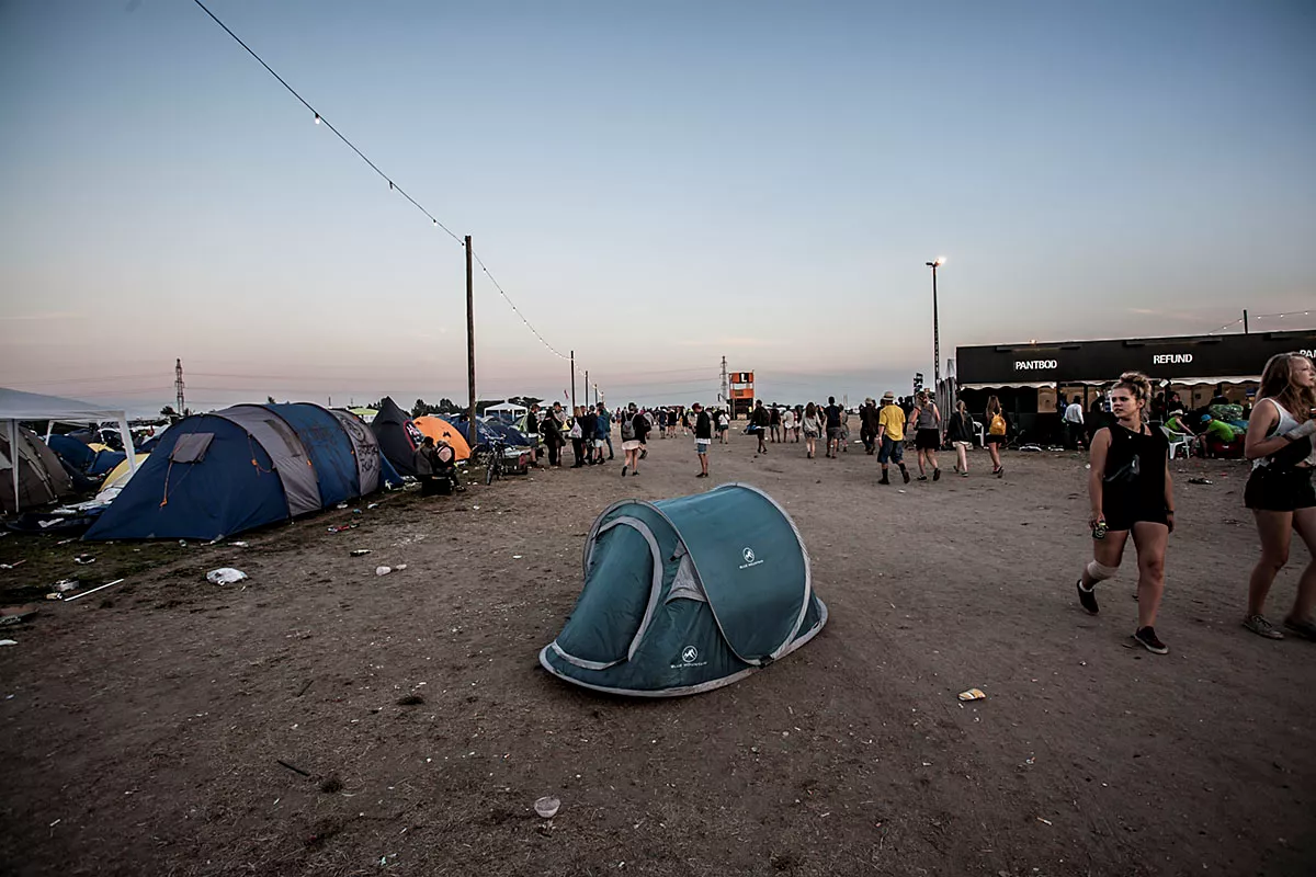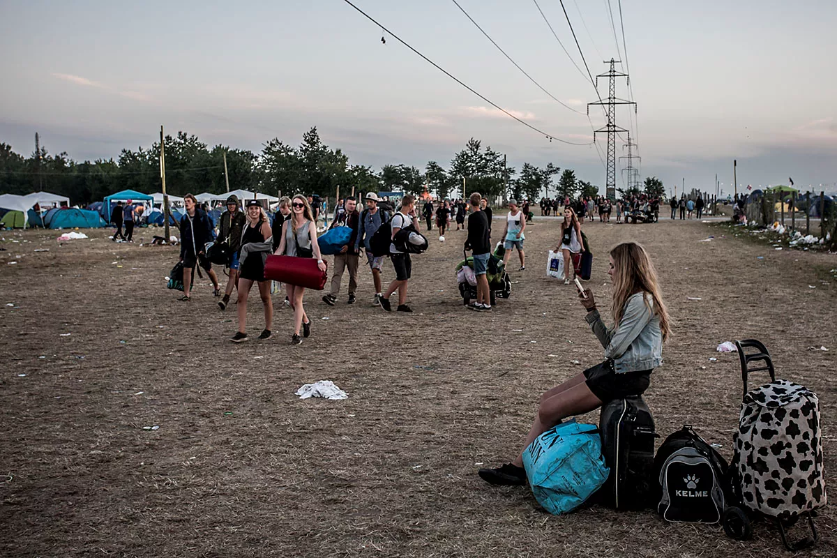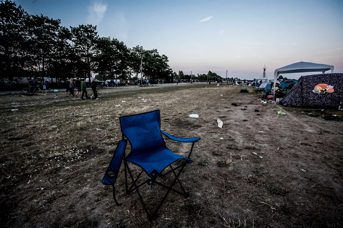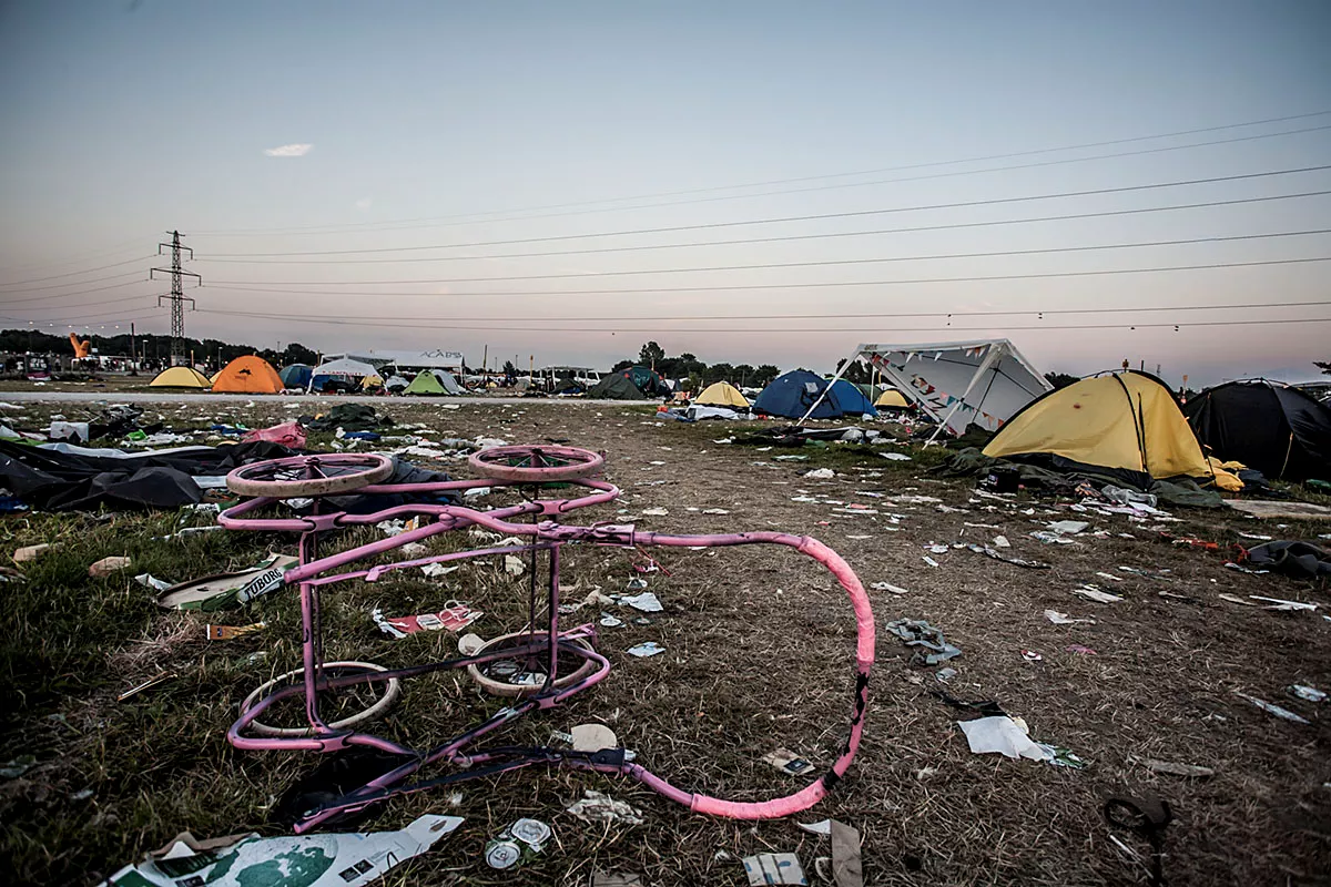 I GAFFAs billedgalleri kan du tage festivalpladsen i selvsyn, efter 80.000 glade mennesker har festet siden forrige søndag. Teltene er smadrede, campingstolene ligger ødelagte med deres sortfarvede ben stikkende op som knækkede ribben, efterladt mad ligger og mugner i den steghede sol. Mest af alt ligner det en stor losseplads.