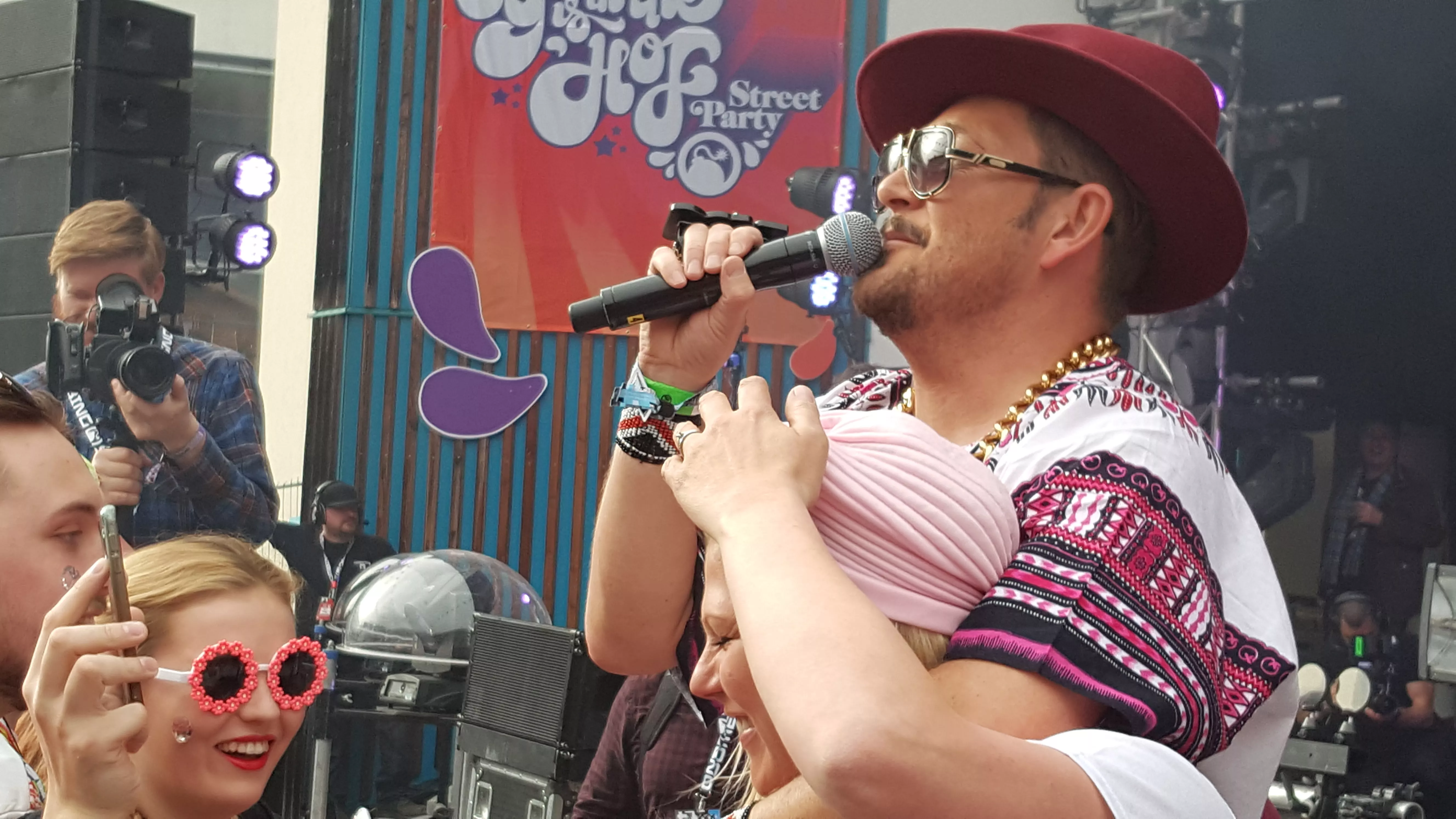 Street Party var festivalstemning, som man kender den fra solrige dage på Roskilde eller Distortion, hvor behovet for at være cool får sig et tiltrængt nøk nedad, og der bliver plads til, at man klæder sig ud. Bomberne var enten klædt ud inden for disco-temaet "Groove is in the hof" eller som en banan, et farvekridt eller Spiderman. I ved, hvordan det er. Midt i et kort øjebliks tankeløshed blev jeg råbt op af et gebrokkent kor. Autocamper-banden fra Manchester havde fundet mig midt i mylderet fra parykker og pastelfarver. Alle sammen var de klædt i nogenlunde samme uniform, dedikeret til et af Snowbombings absolutte hof-navne.