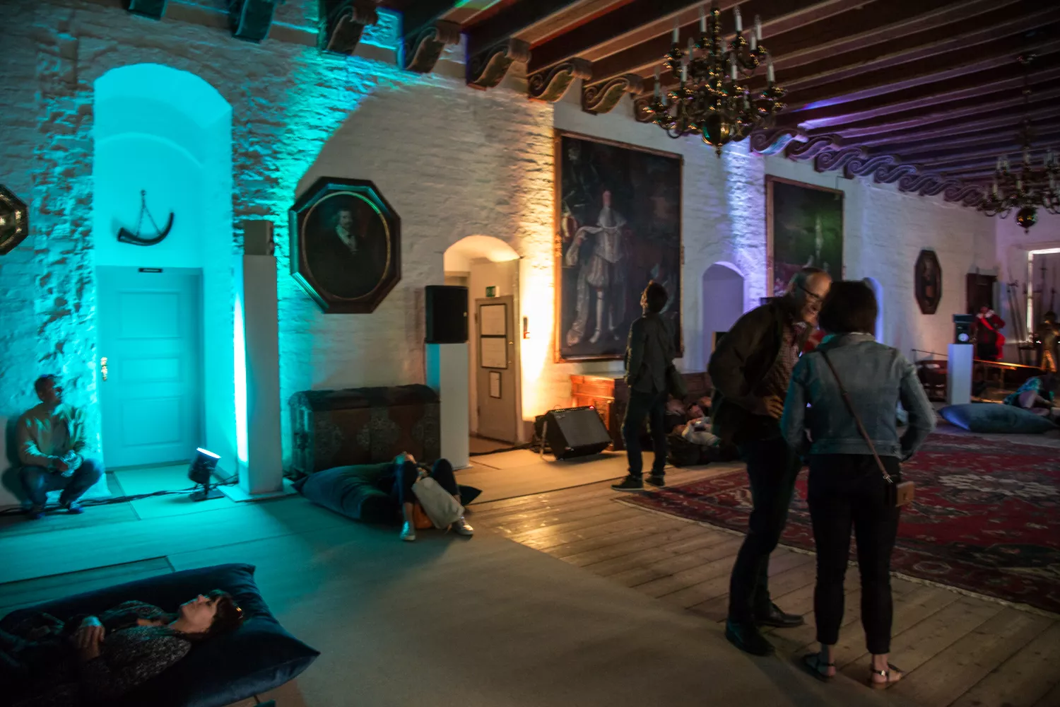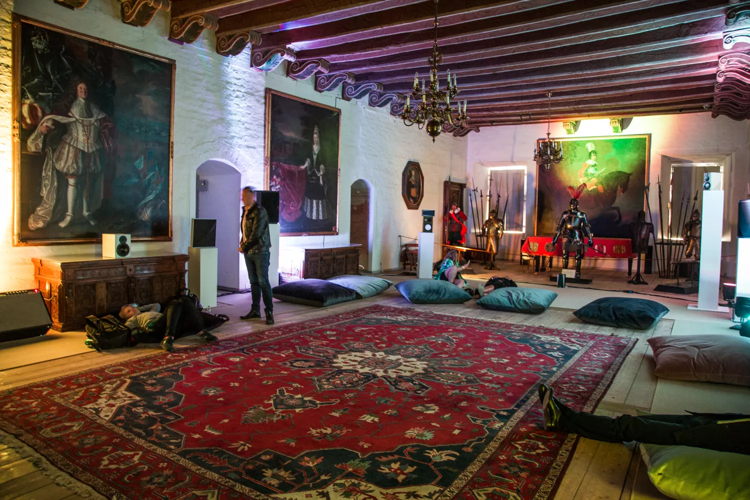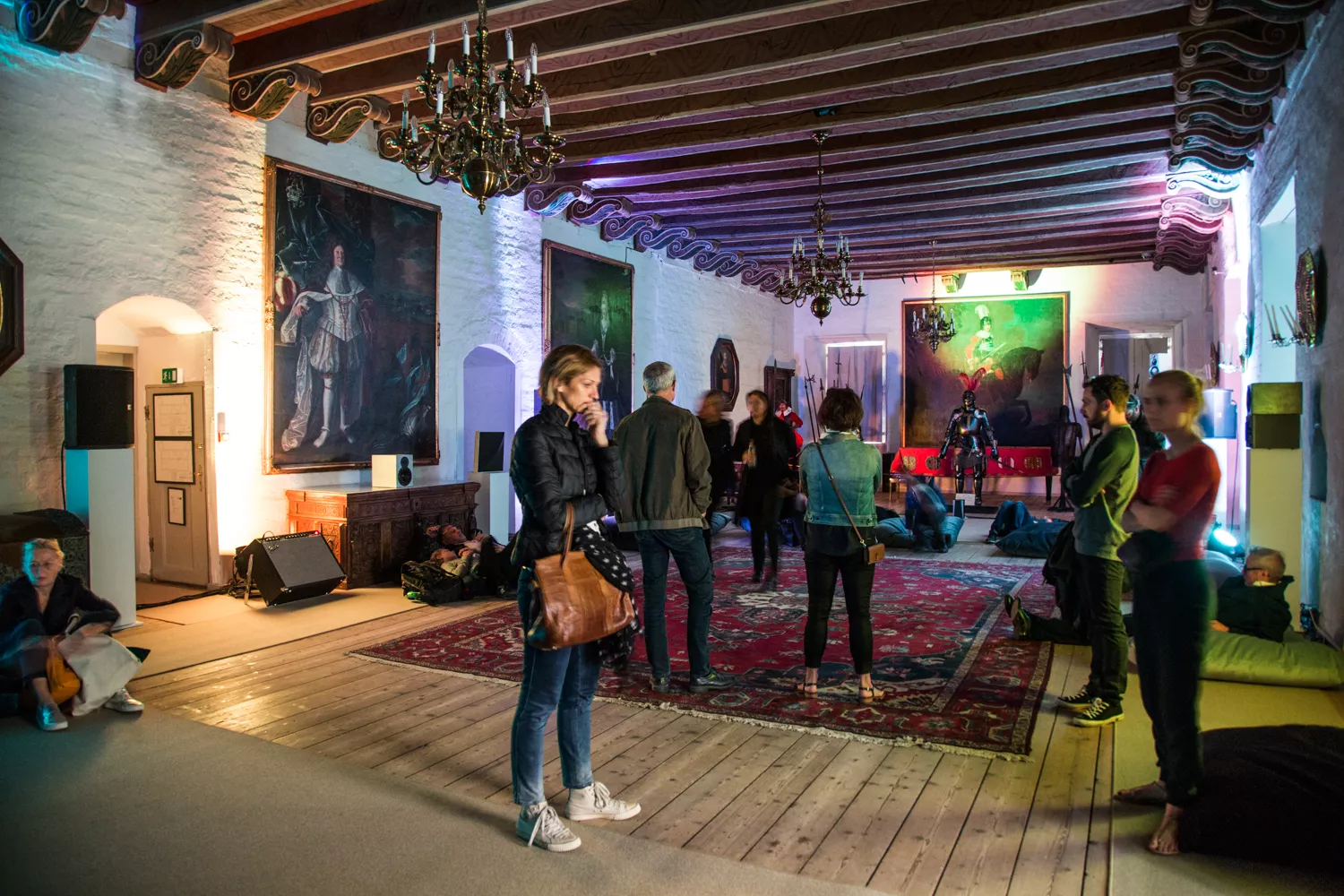 Egeskovs riddersal var mørklagt til anledningen, med et par enkelte LED-lamper her og der, så folk lige akkurat kunne finde vej ind (uden at snuble over rustninger og den slags). Højttalere var placeret forskellige steder, naturligt nok langs vægge, således at man, såfremt man befandt sig i omtrent midten af rummet, oplevede et tydeligt tredimensionelt mix, hvor vokal befandt sig et sted, dybe droner et andet, højfrekvente synthesizere et tredje, etc. Man kunne egentlig godt fornemme, at mixet var sat kyndigt sammen, og med udgangspunkt netop i musikken. I nogle 3D-mix kan der være en tendens til at overdrive de nye rumlige virkemidler, som pludselig er til stede i modsætning til traditionel stereo, således at lyde sejler rundt i et væk. Der findes selvsagt situationer, hvor den slags fungerer, men også situationer hvor det ikke er tilfældet.