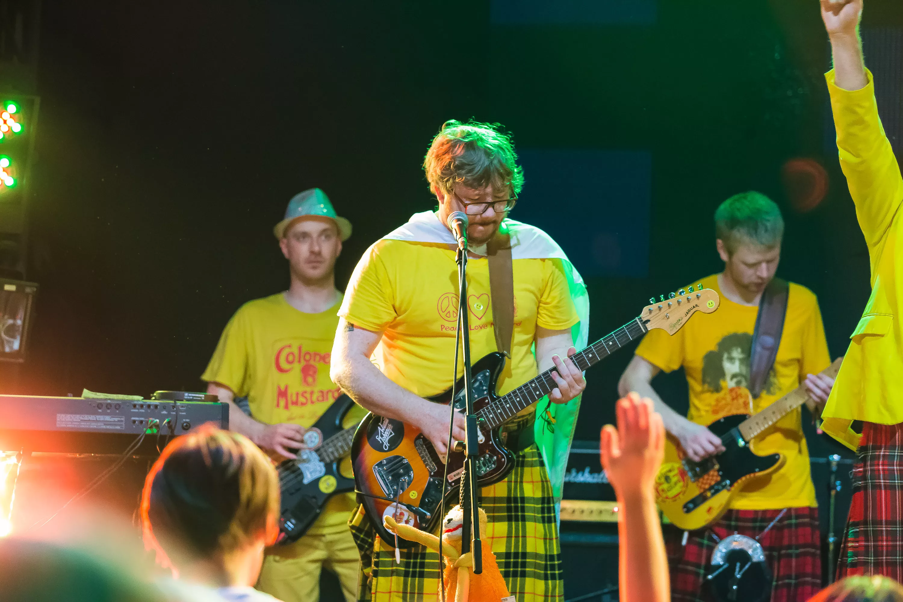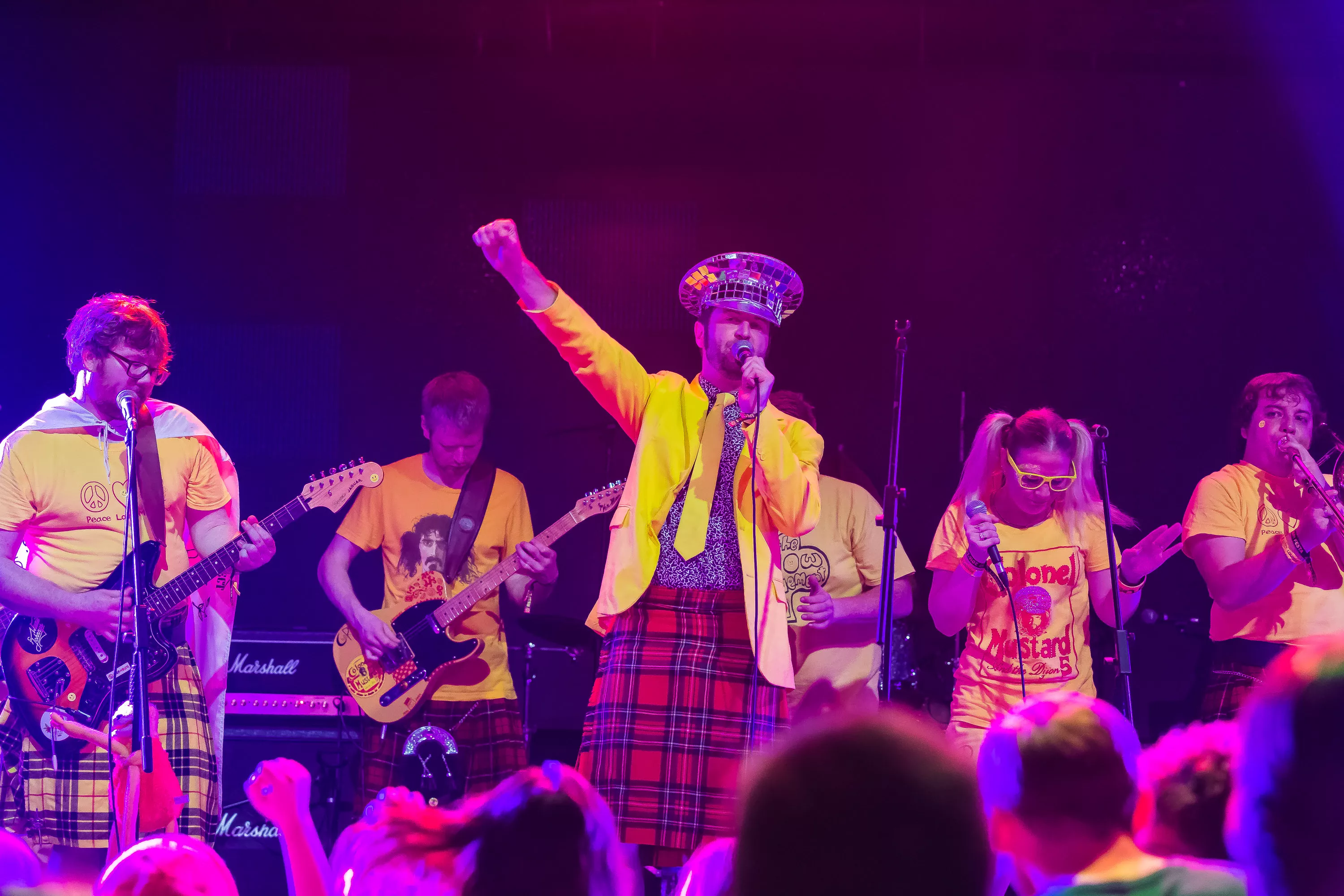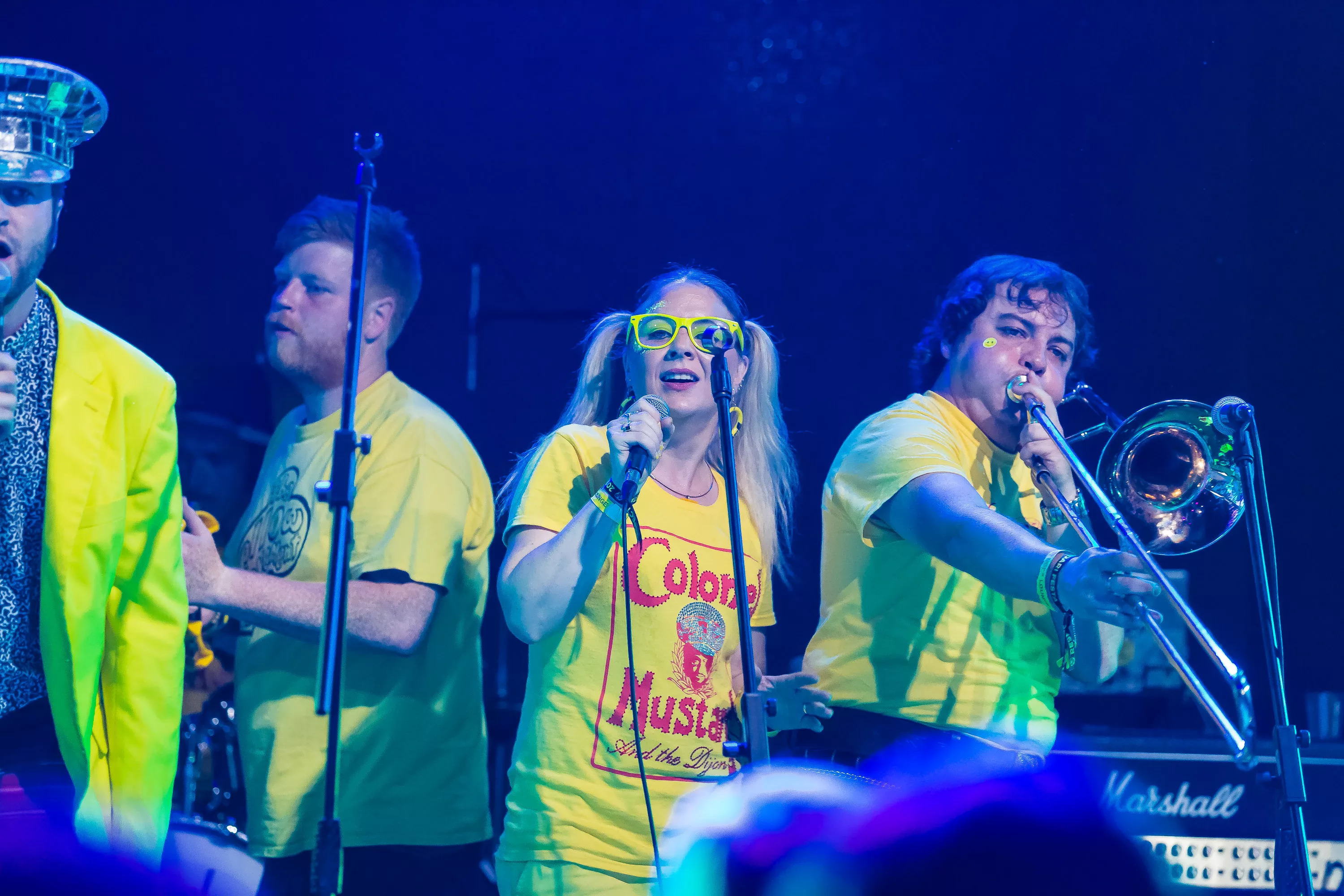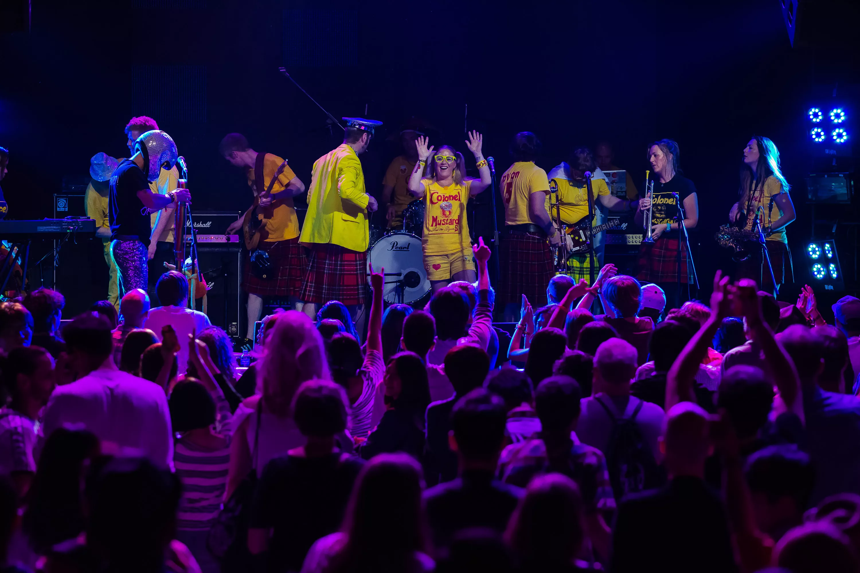 Derefter går turen over til Muv Hall, hvor festivalens bedste partyband er klar på scenen. De kommer fra Skotland og hedder Colonel Mustard & The Dijon 5. Bandet tæller hele 13 mænd/kvinder på scenen plus en overgearet danser i sølvkostume. Forsangeren har en discokugle som hat, og ellers har alle gule sennepskostumer. Musikalsk er stilen en ukontrolleret blanding af soul, disco og dance med referencer til alt fra Happy Mondays til James Brown, Primal Scream, George Clinton, Frank Zappa og andet godt. Det kæmpe band formår på ingen tid at få hele salen omdannet til et sydende fest inferno, hvor publikum og band er lige gode om at skabe koncerten, være på scenen og lave kække danse moves. Der er en uhørt fællesskabsfølelse i salen, og det er et af bedste festorkestre, som jeg nogensinde har set. Ganske forrygende!