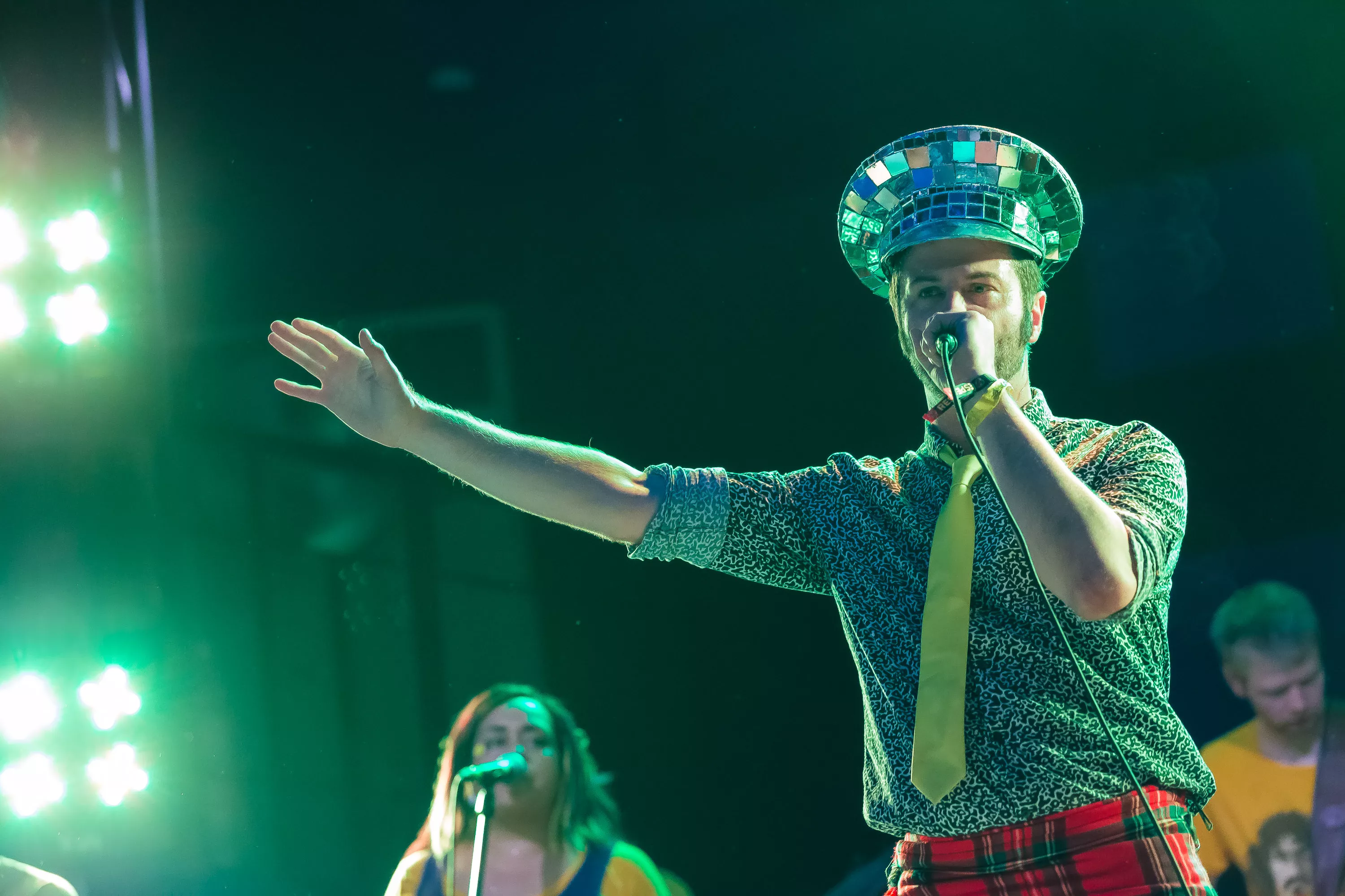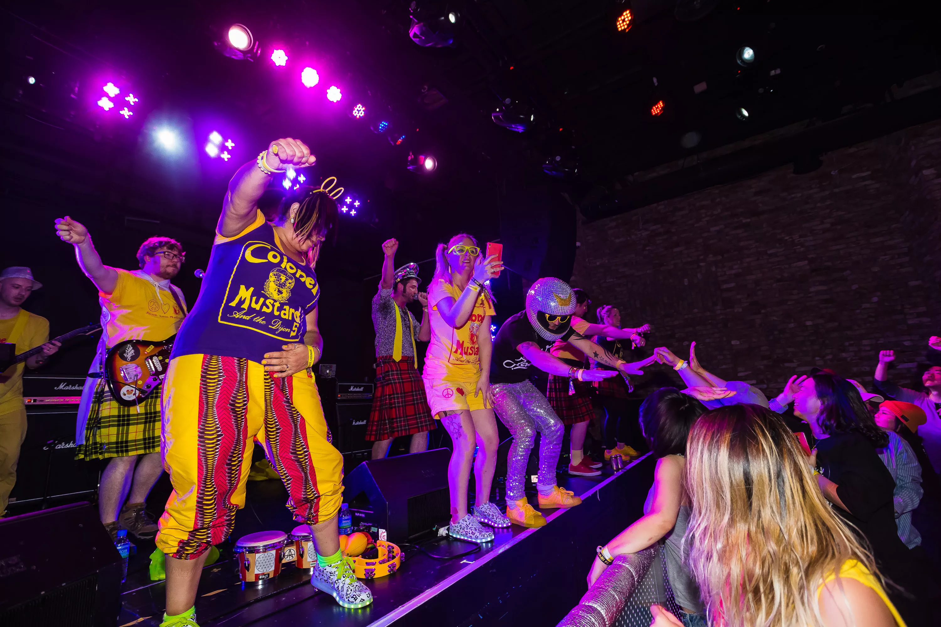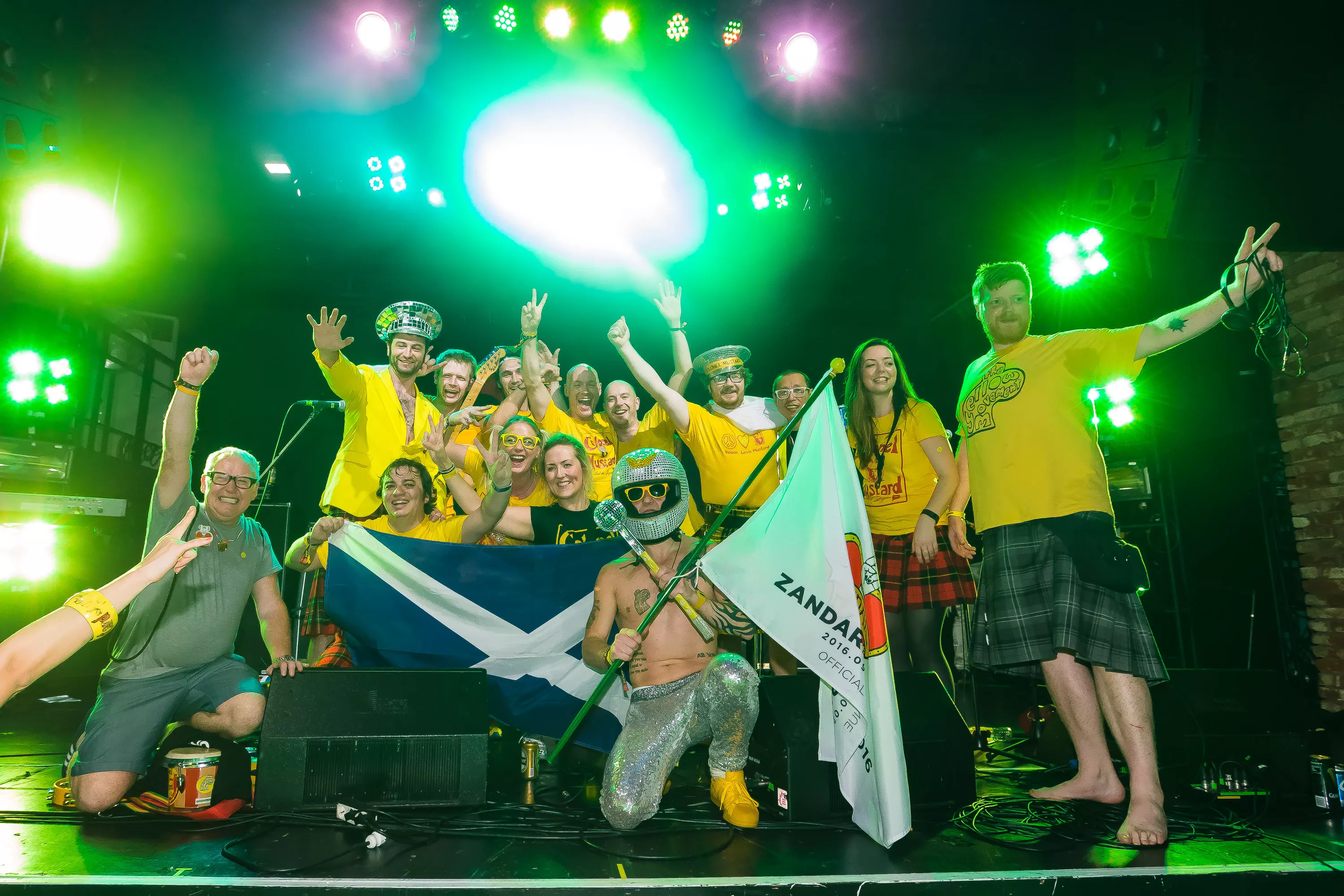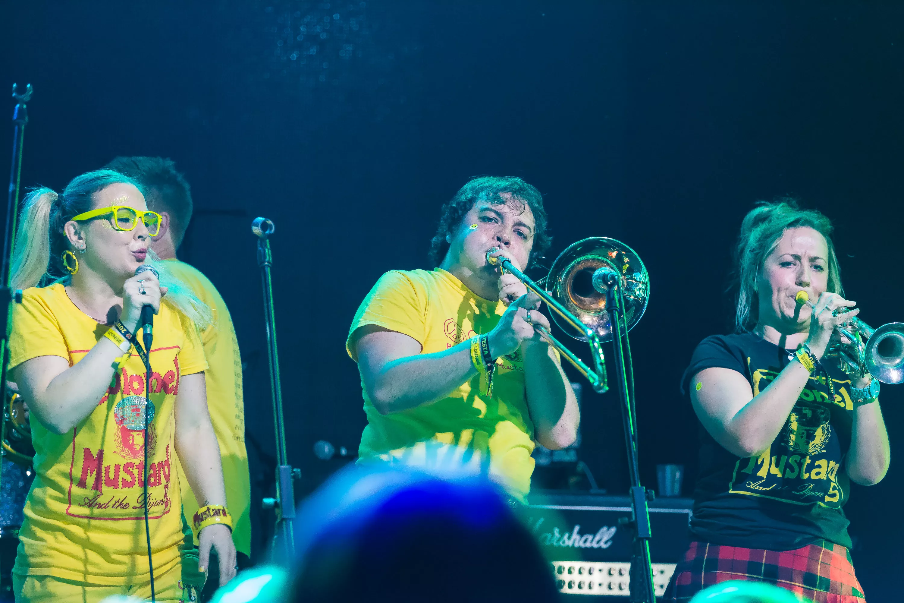 Derefter går turen over til Muv Hall, hvor festivalens bedste partyband er klar på scenen. De kommer fra Skotland og hedder Colonel Mustard & The Dijon 5. Bandet tæller hele 13 mænd/kvinder på scenen plus en overgearet danser i sølvkostume. Forsangeren har en discokugle som hat, og ellers har alle gule sennepskostumer. Musikalsk er stilen en ukontrolleret blanding af soul, disco og dance med referencer til alt fra Happy Mondays til James Brown, Primal Scream, George Clinton, Frank Zappa og andet godt. Det kæmpe band formår på ingen tid at få hele salen omdannet til et sydende fest inferno, hvor publikum og band er lige gode om at skabe koncerten, være på scenen og lave kække danse moves. Der er en uhørt fællesskabsfølelse i salen, og det er et af bedste festorkestre, som jeg nogensinde har set. Ganske forrygende!